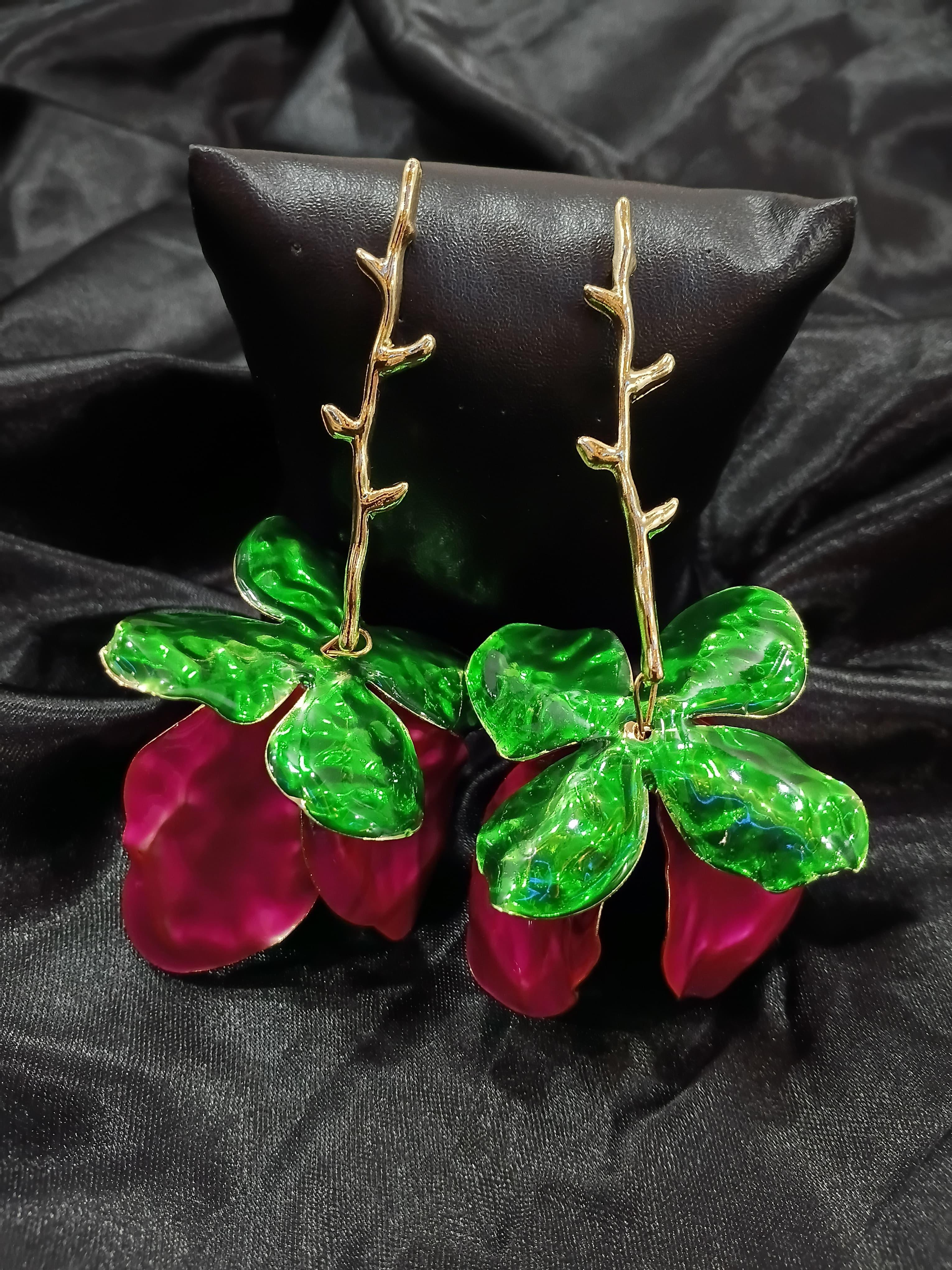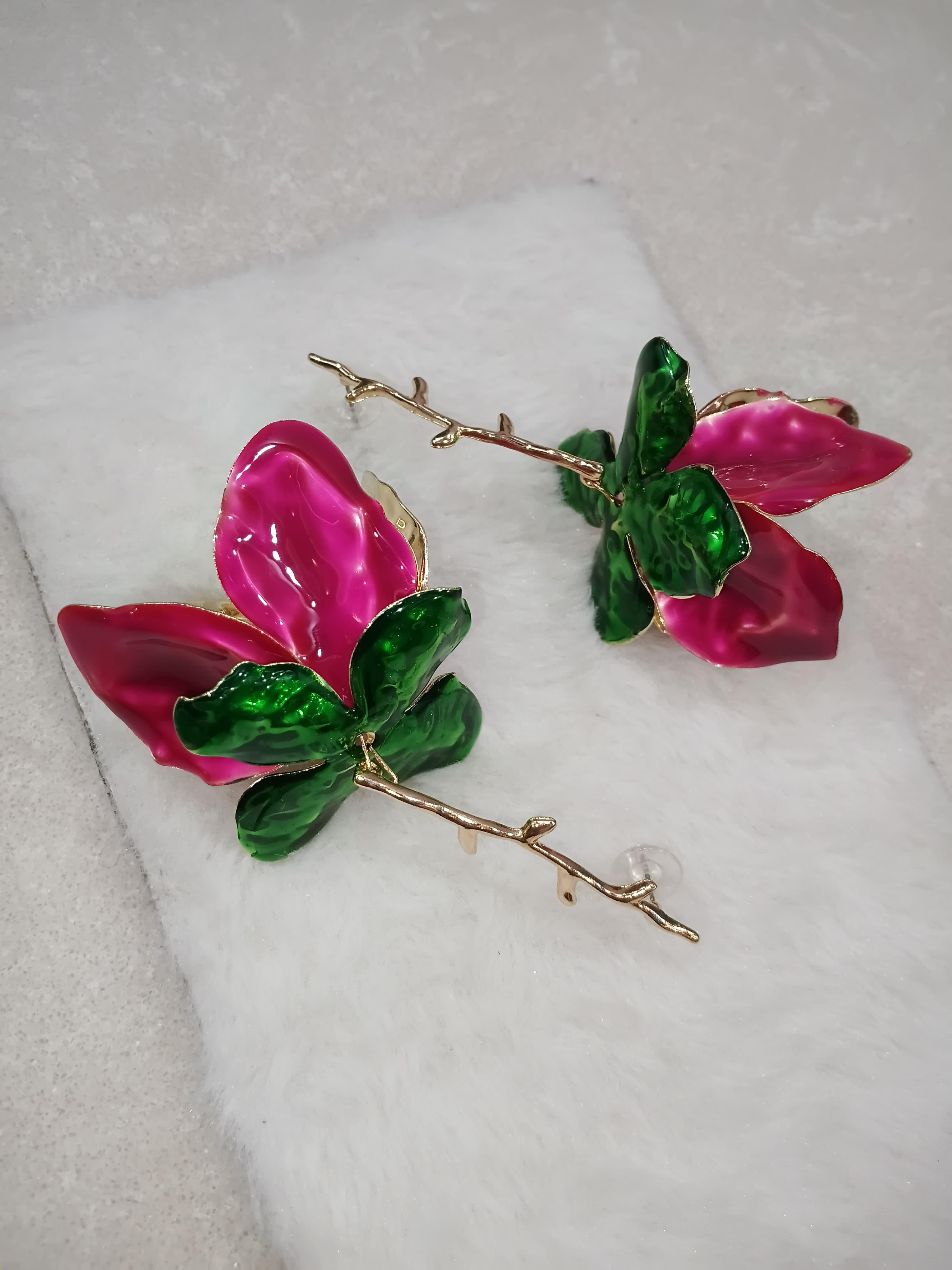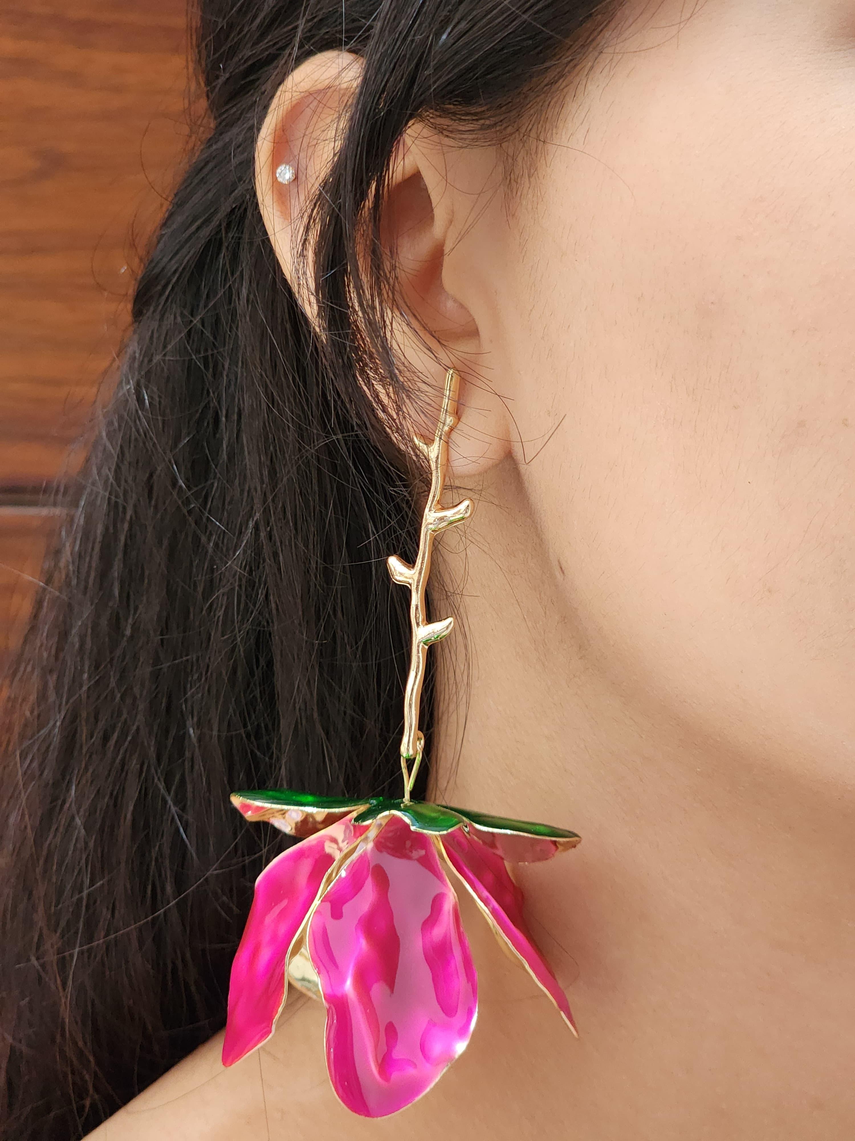Step into a world of floral elegance with our Magnolia Bloom Enamel Statement Earrings – a bold and enchanting addition to your jewellery collection, exclusively from Luxe Aabhushan. Meticulously crafted to mirror the delicate bloom of a magnolia flower, these earrings fuse rich magenta-pink petals with deep green enamel leaves, accented by a striking golden stem design that brings nature-inspired luxury to life.