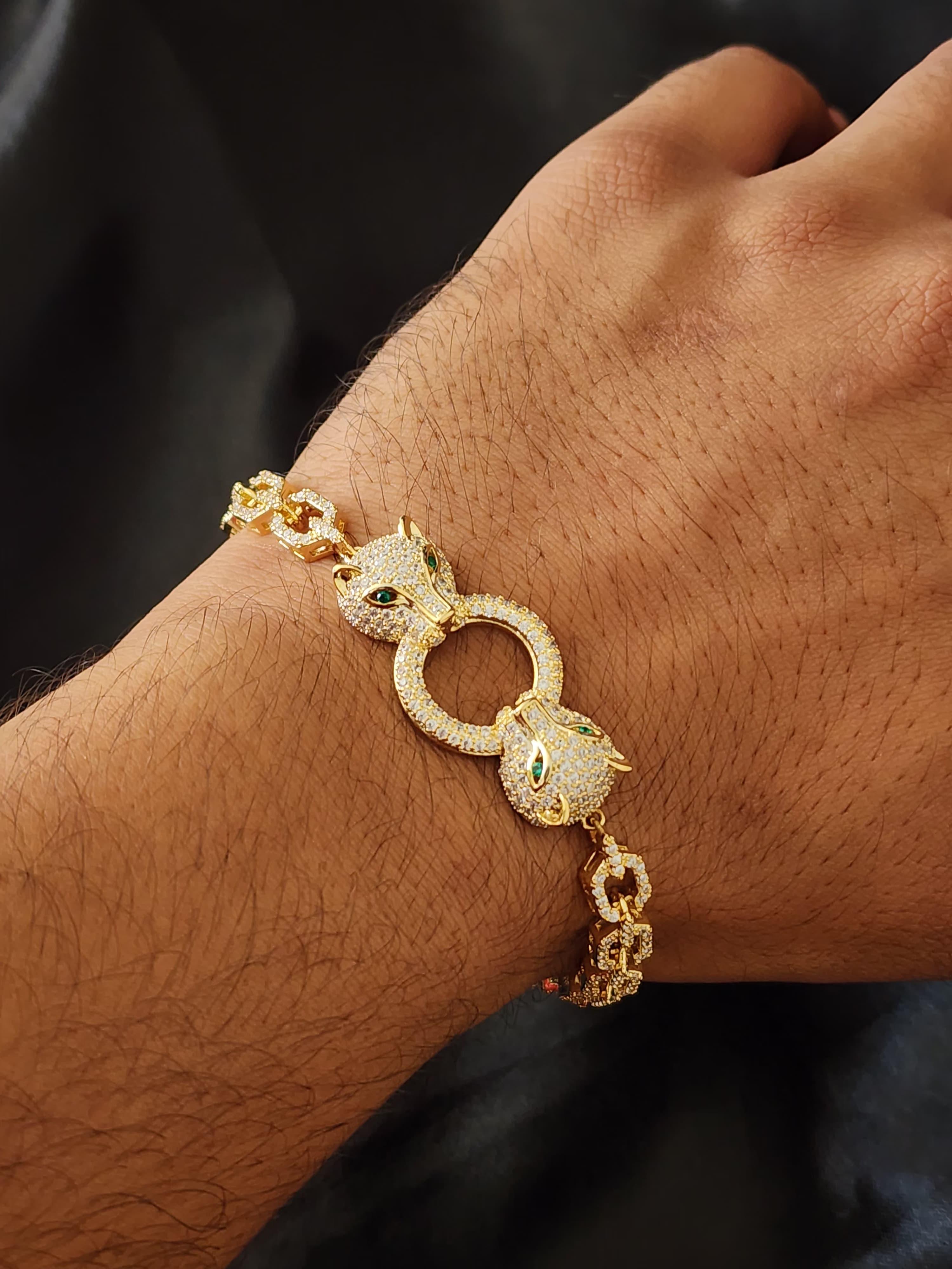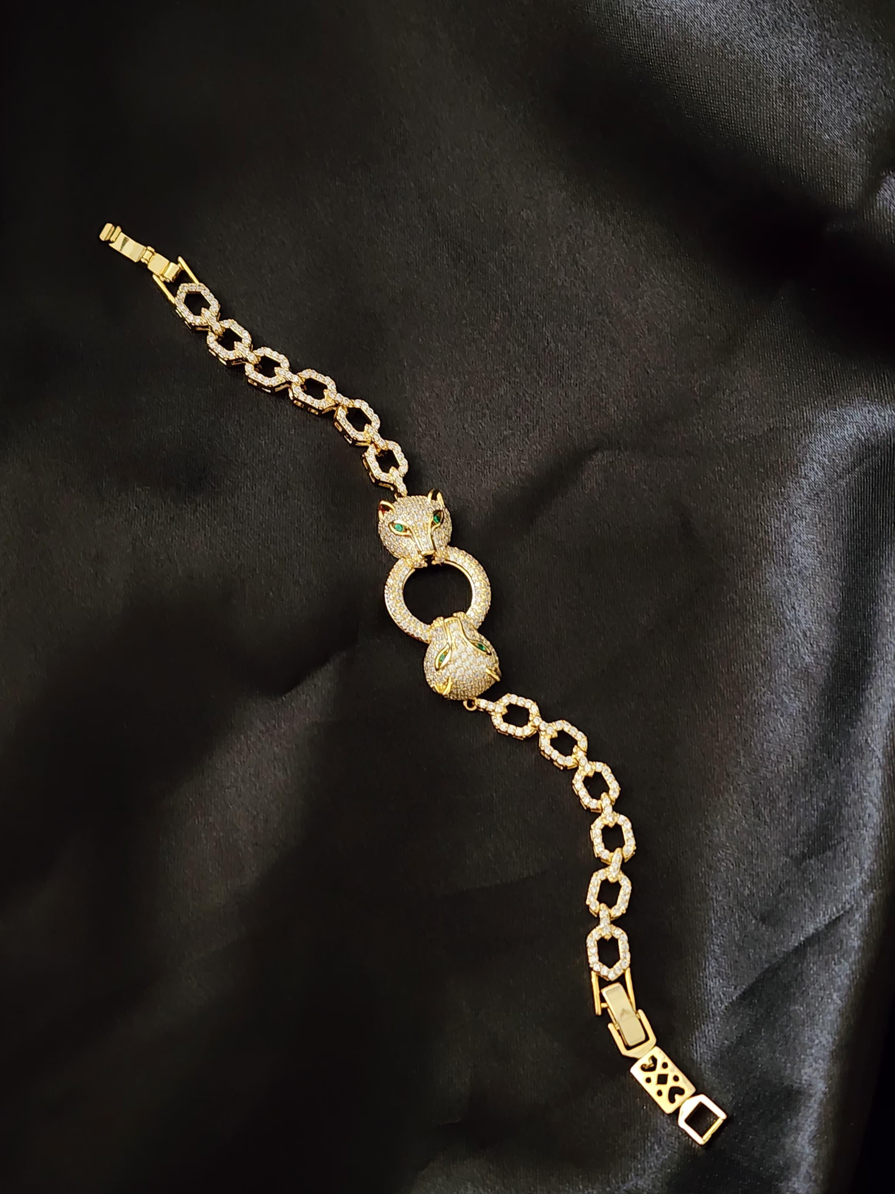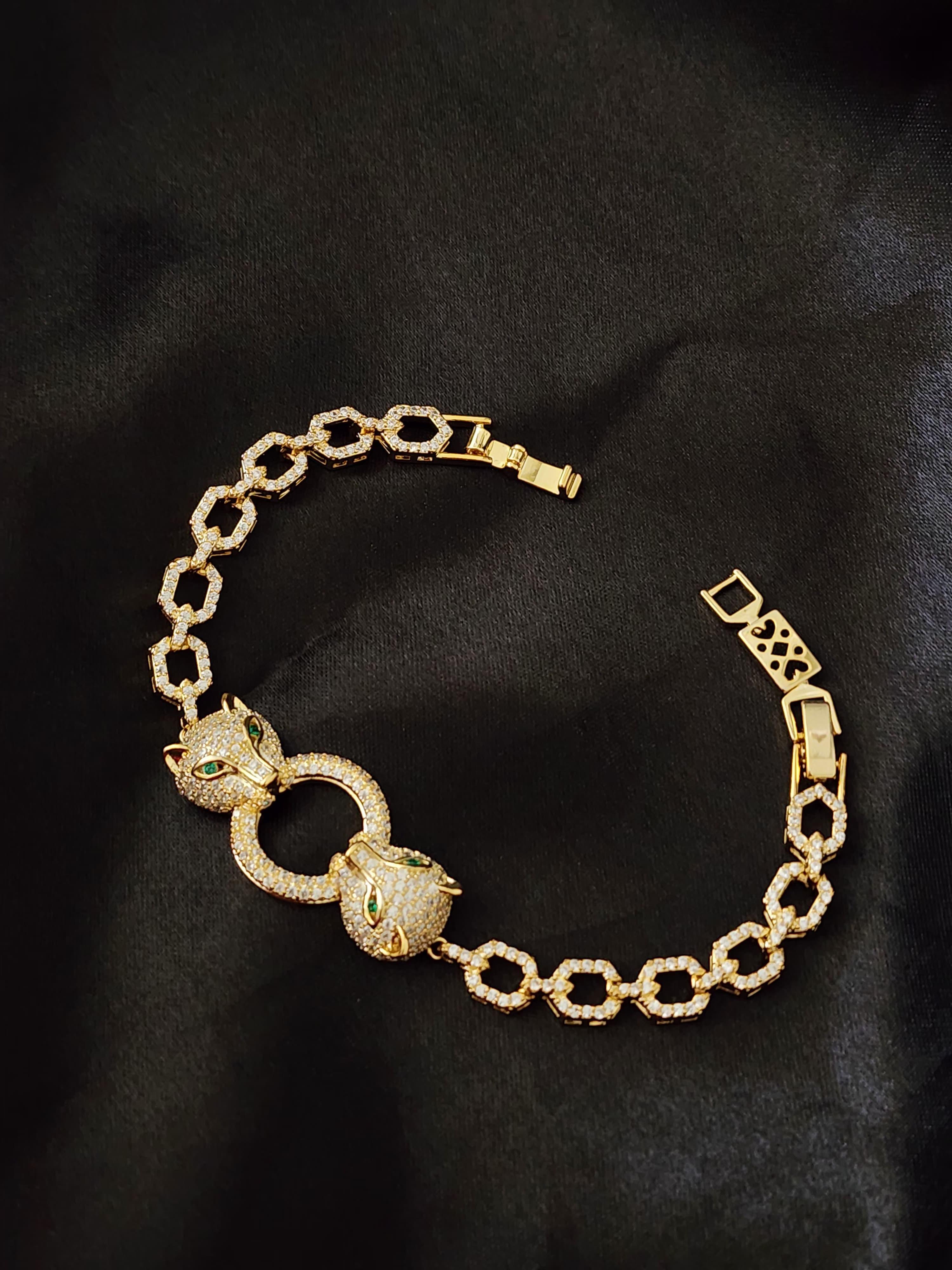 Command attention with the bold elegance of the Majestic Panther Bite Bracelet from Luxe Aabhushan — a tribute to strength, luxury, and fine craftsmanship. The centerpiece of this design features two intricately sculpted panther heads, locked in a symbolic circle bite. Adorned with hand-set AAA+ Cubic Zirconia and finished with captivating green enamel eyes, the bracelet embodies fierce sophistication.