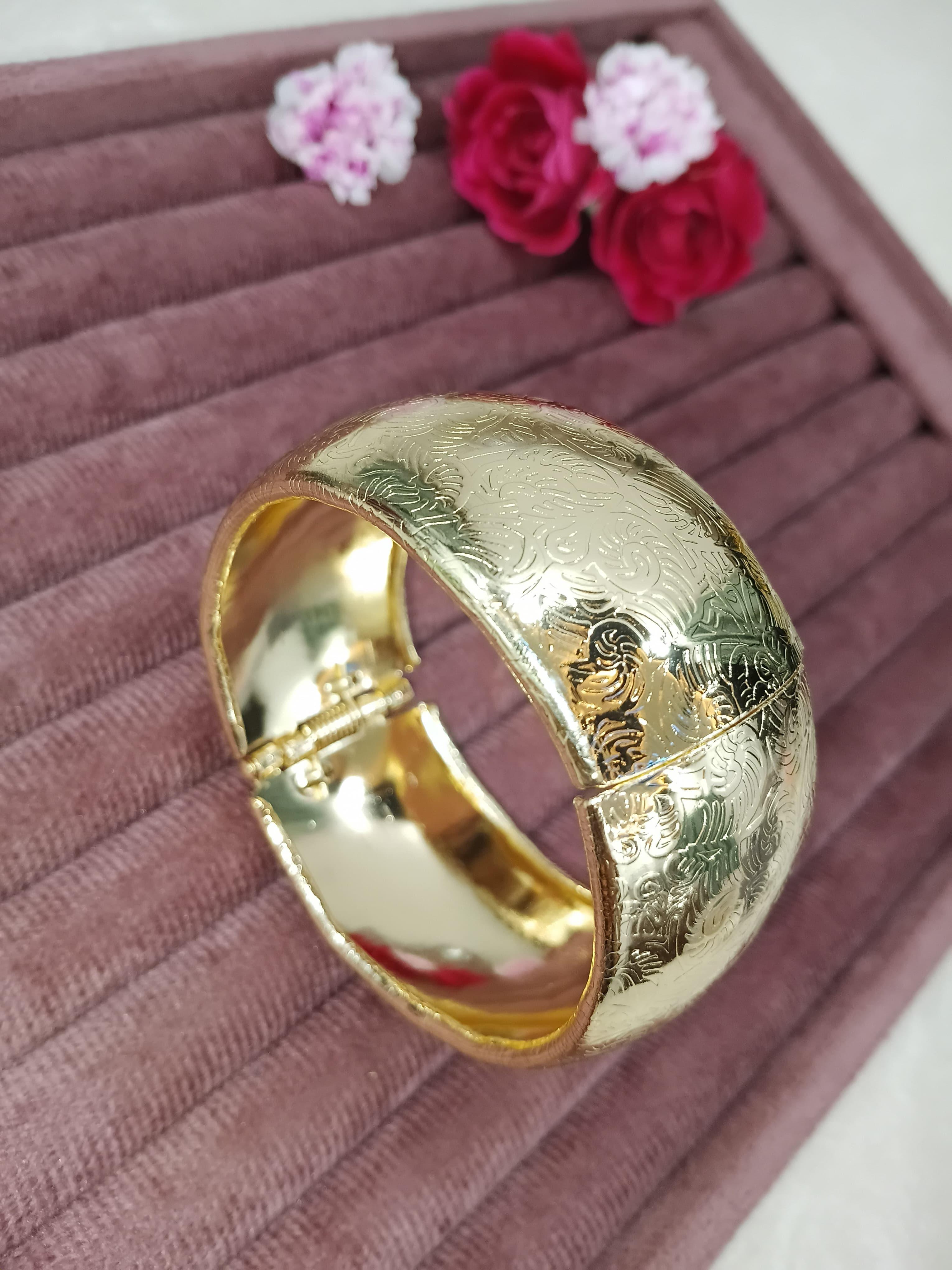 Expertly crafted from a high-grade alloy base and finished in mirror-shine 22K gold plating, the bracelet features a gentle dome shape adorned with delicate engraved floral patterns. The etched detailing adds a vintage charm while the polished surface creates a radiant reflection of light with every movement.
