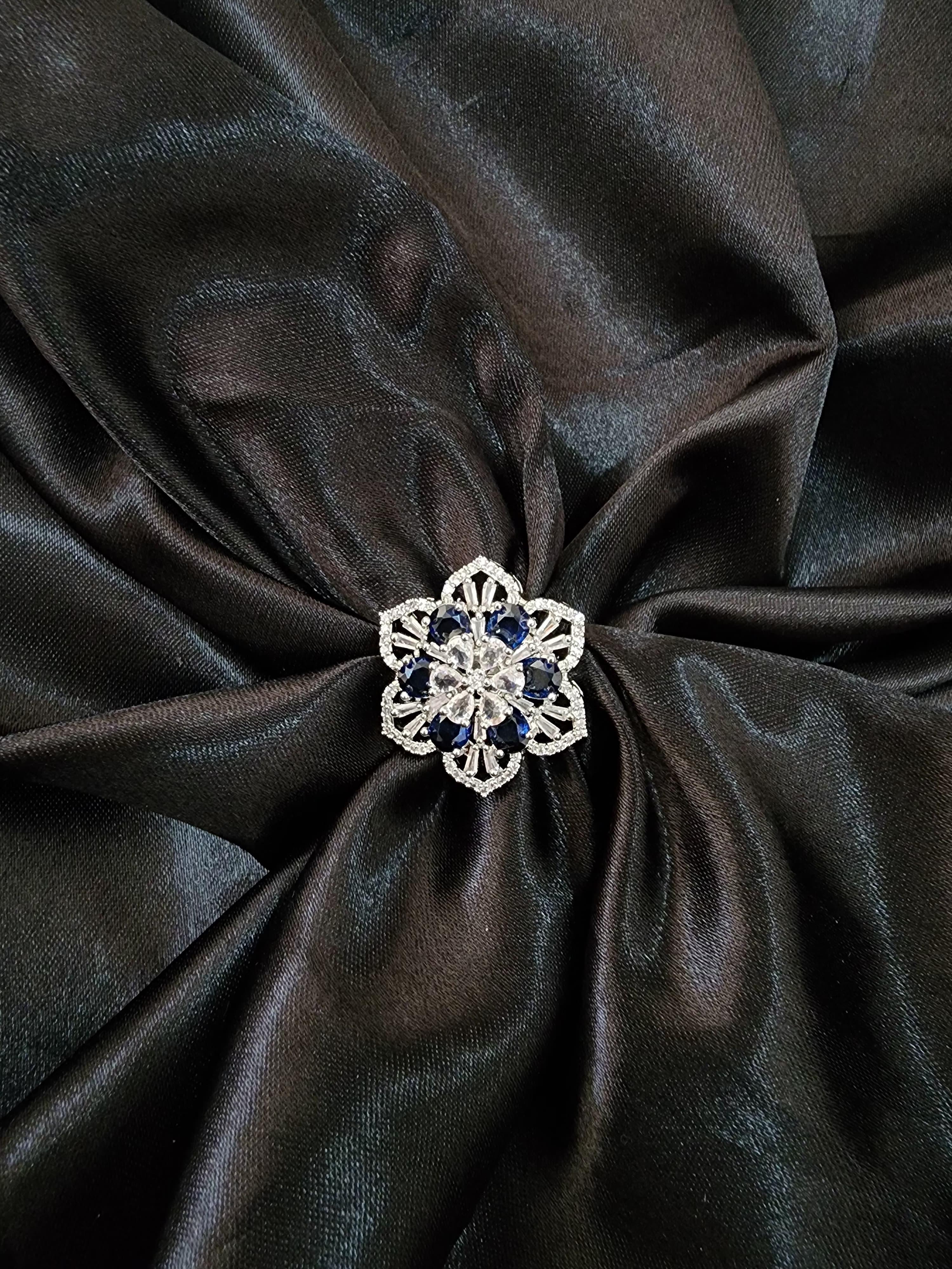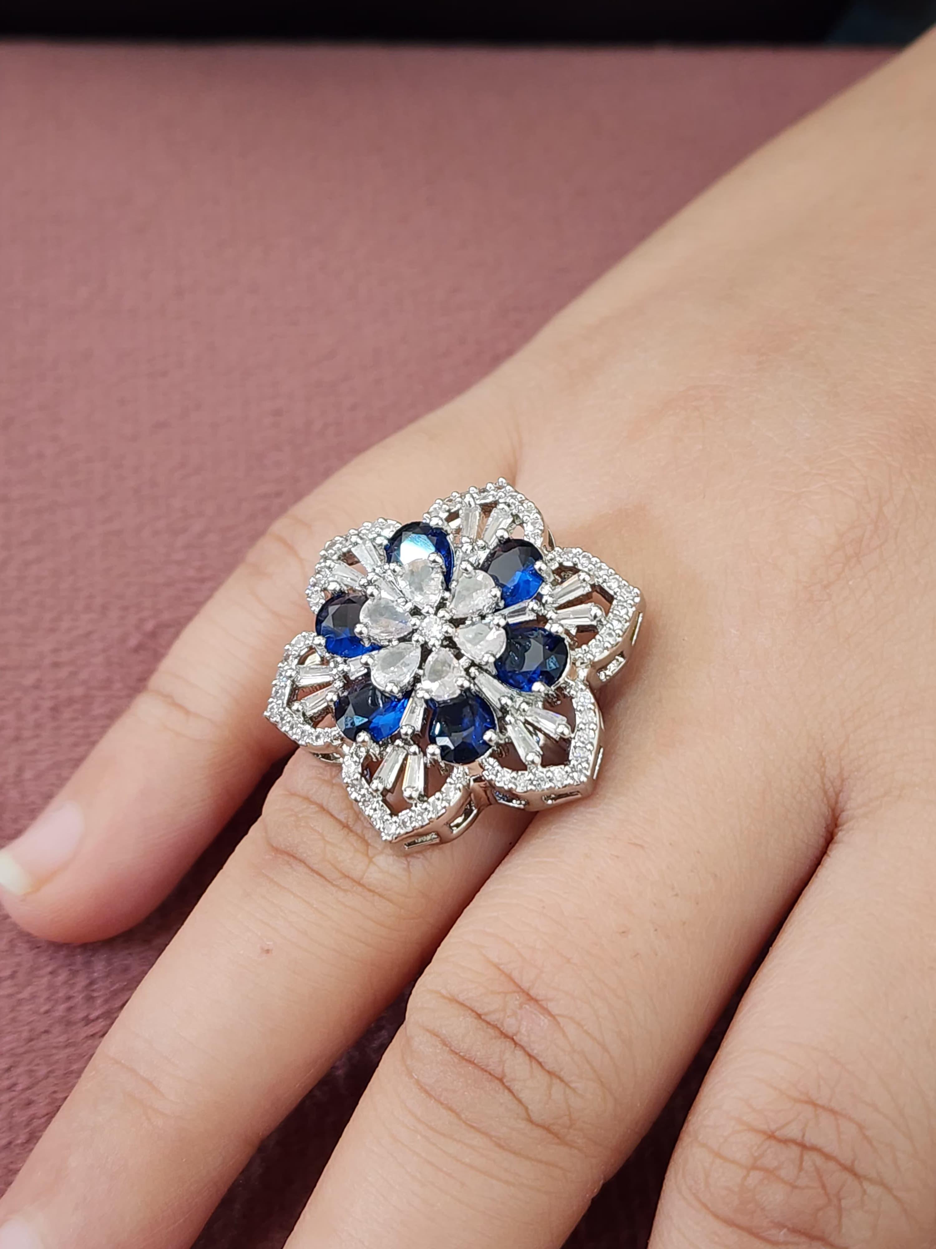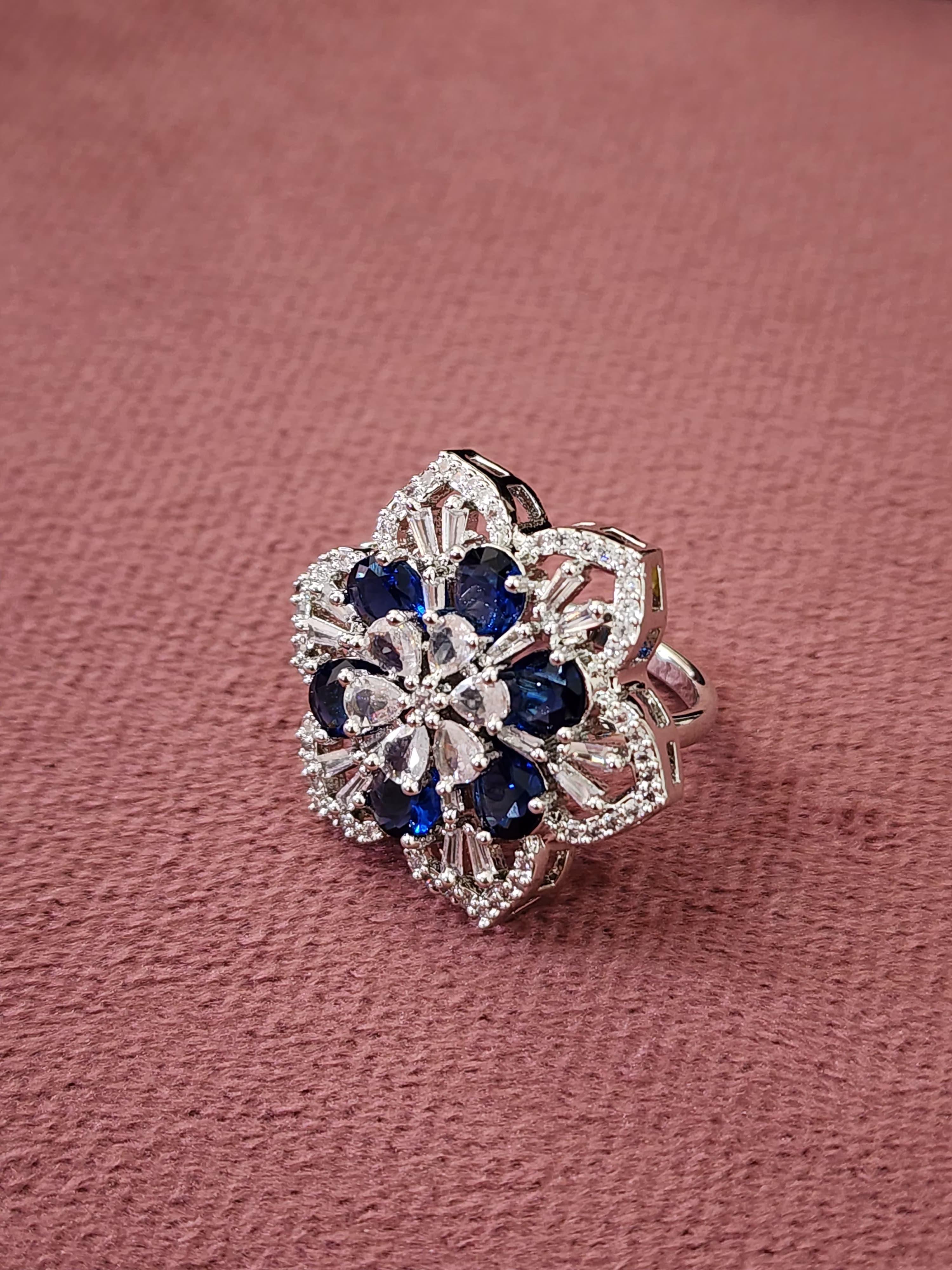The ring features a striking floral silhouette crafted with precision, encrusted with a radiant mix of deep sapphire-blue stones and sparkling clear American diamonds. At the center, delicately arranged teardrop and marquise-cut stones form the heart of the bloom, surrounded by intricate layers of baguette-cut accents that catch the light beautifully from every angle.
