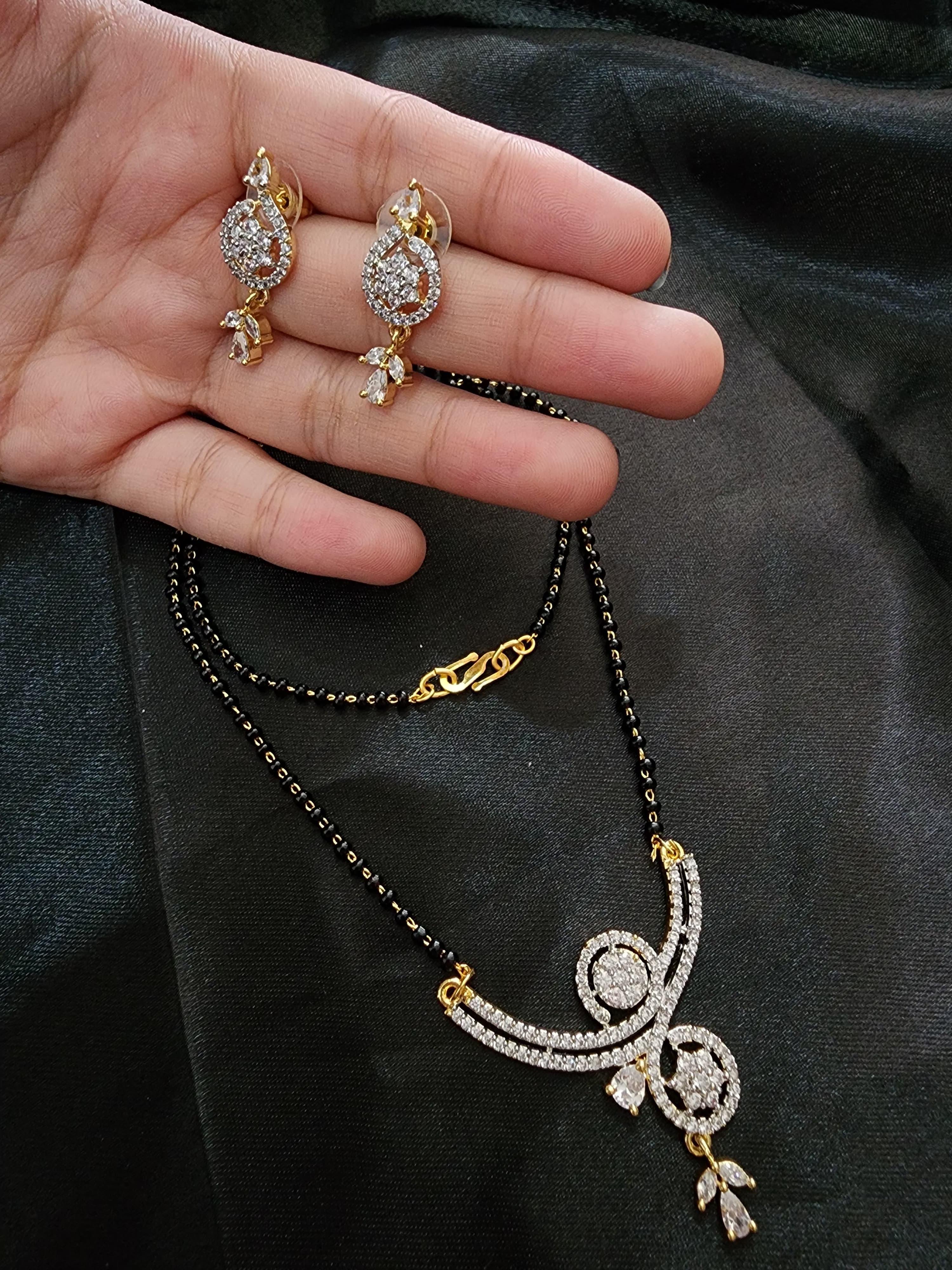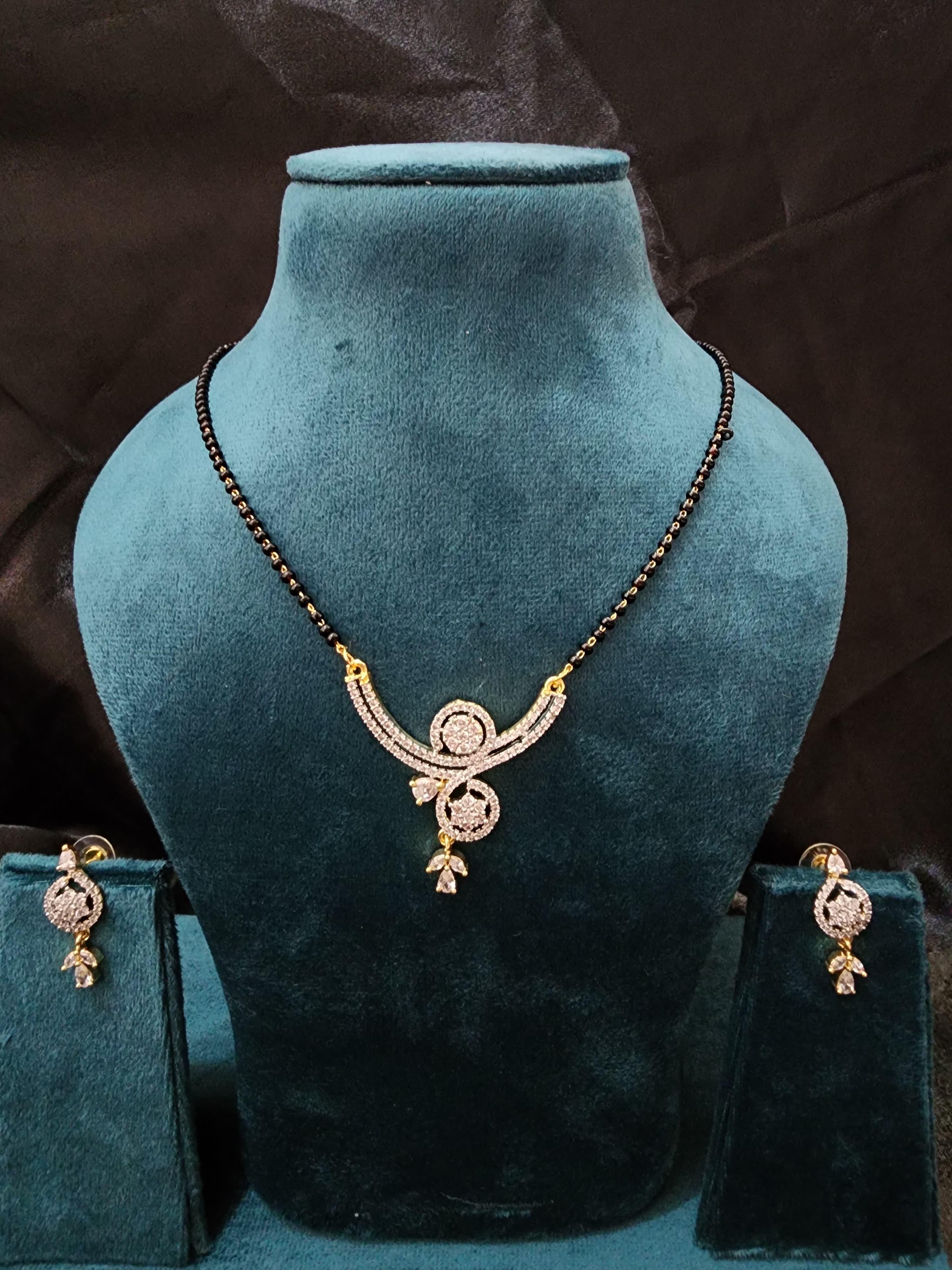 The necklace is strung with classic black onyx beads, symbolising protection and balance in married life. Complementing the necklace are matching dangling earrings that mirror the pendant design, creating a harmonious and complete look.