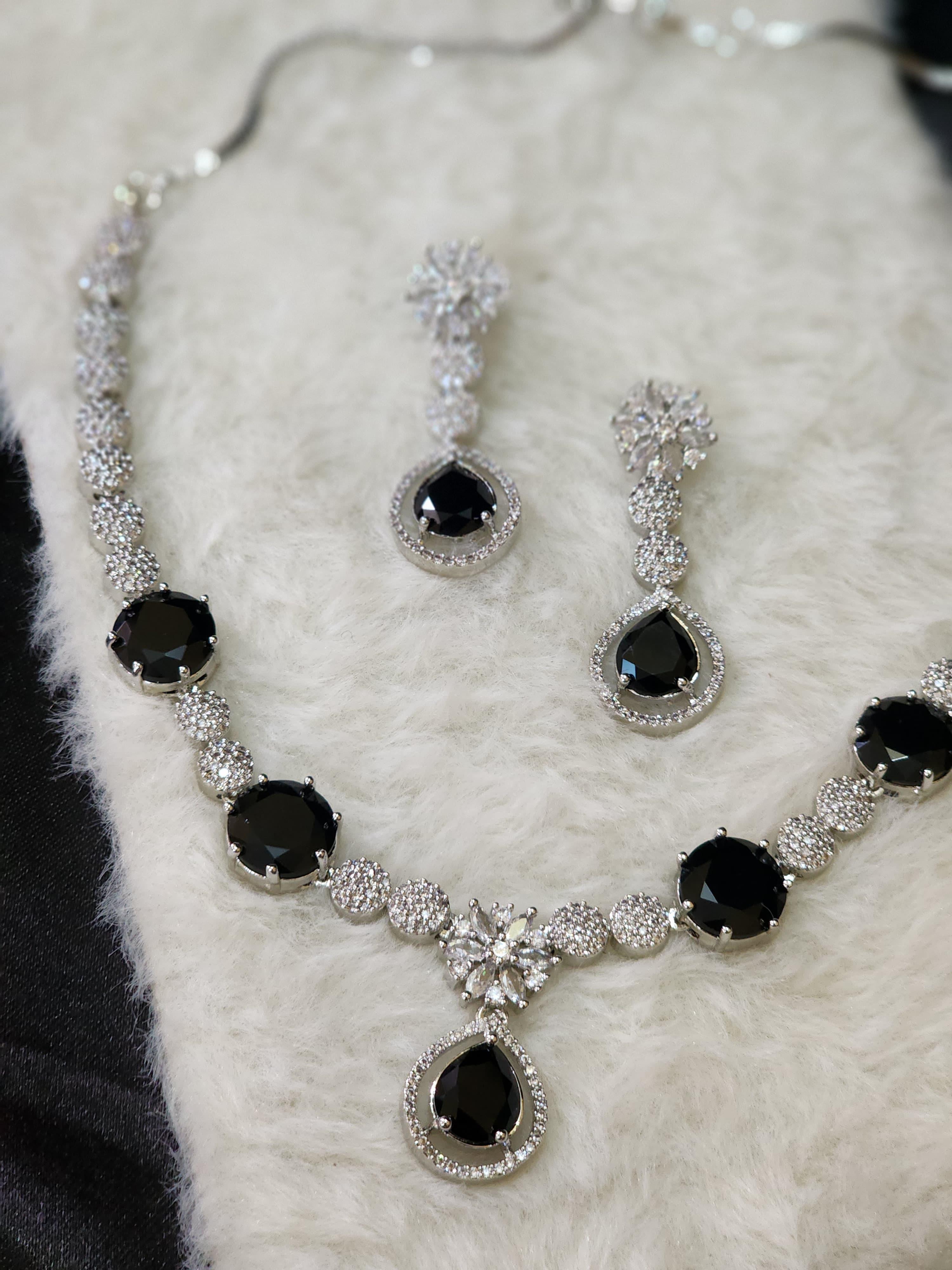 Featuring a regal arrangement of rich black stones gracefully paired with brilliant American diamonds, the necklace forms a captivating silhouette of radiance. The meticulously set round and teardrop stones create an elegant cascade, culminating in a stunning centerpiece. Paired with matching drop earrings that mirror the necklace's design, this set adds refined drama to both ethnic and contemporary wear.