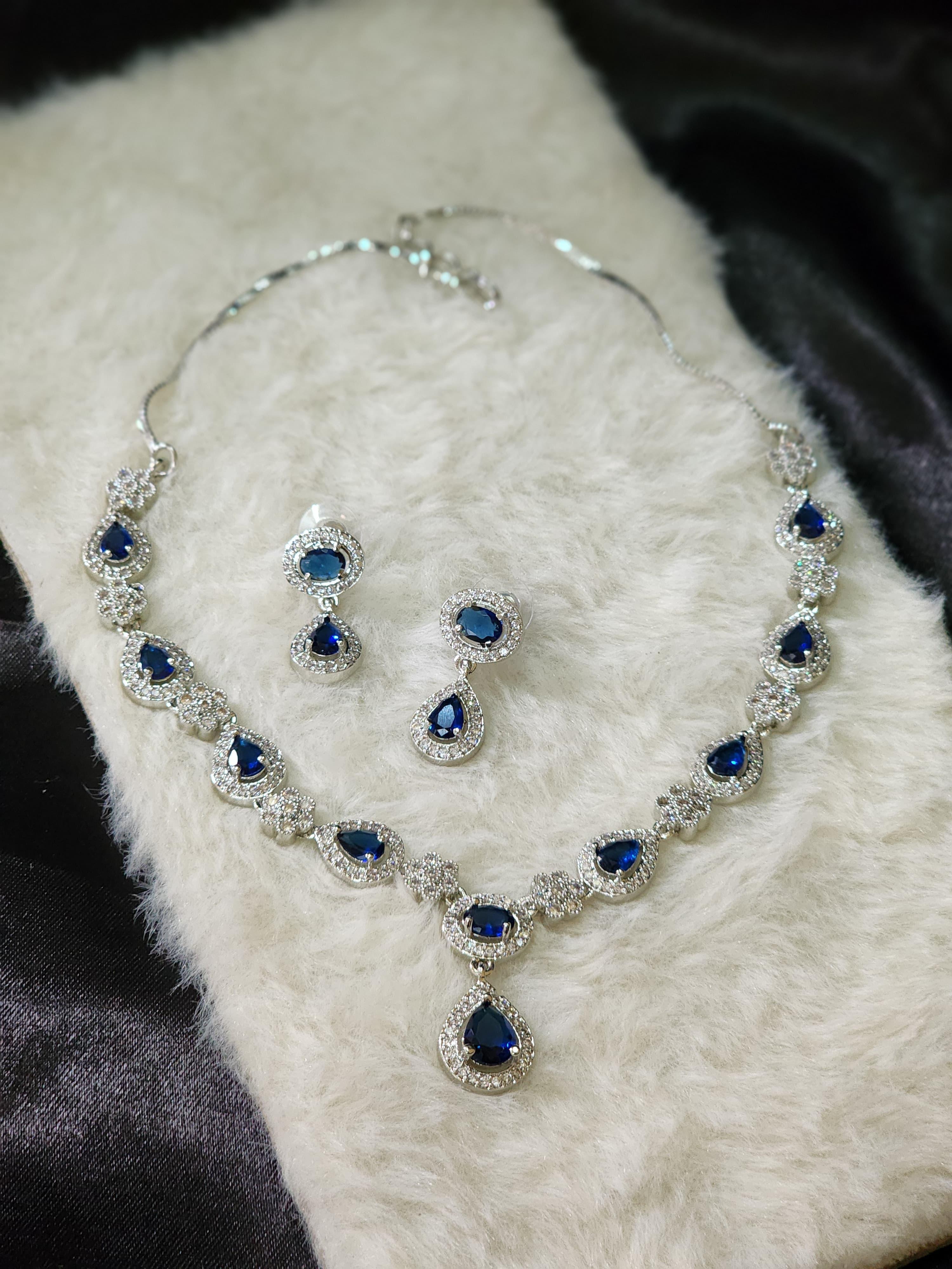 Make a statement of timeless elegance with Luxe Aabhushan’s Noir Royale Blue AD Necklace Set, a majestic creation for the woman who embraces luxury and grace. This set features deep royal blue teardrop and oval-cut stones, intricately framed in a bed of dazzling American Diamonds. The silver-toned base enhances the brilliance of each stone, exuding a sophisticated sparkle with every turn.