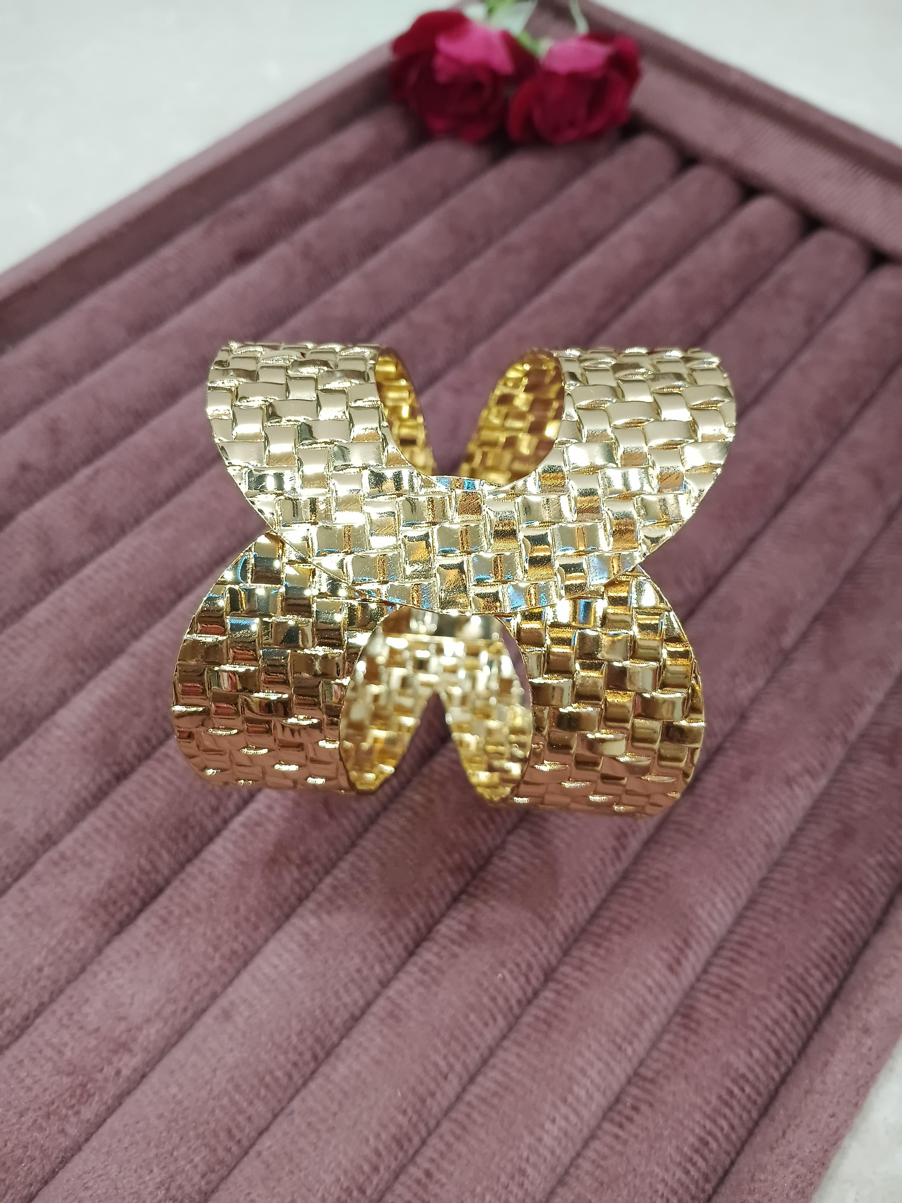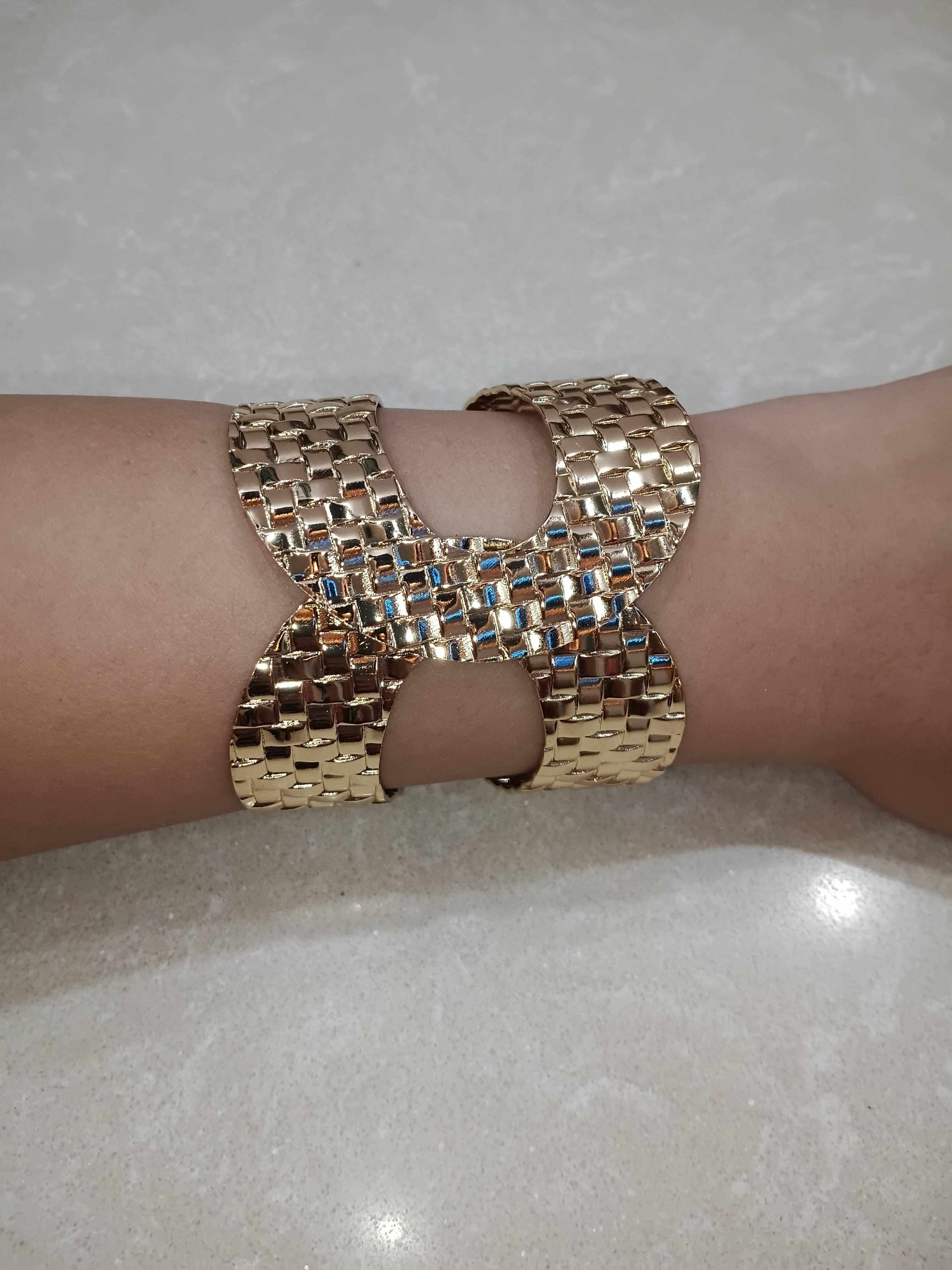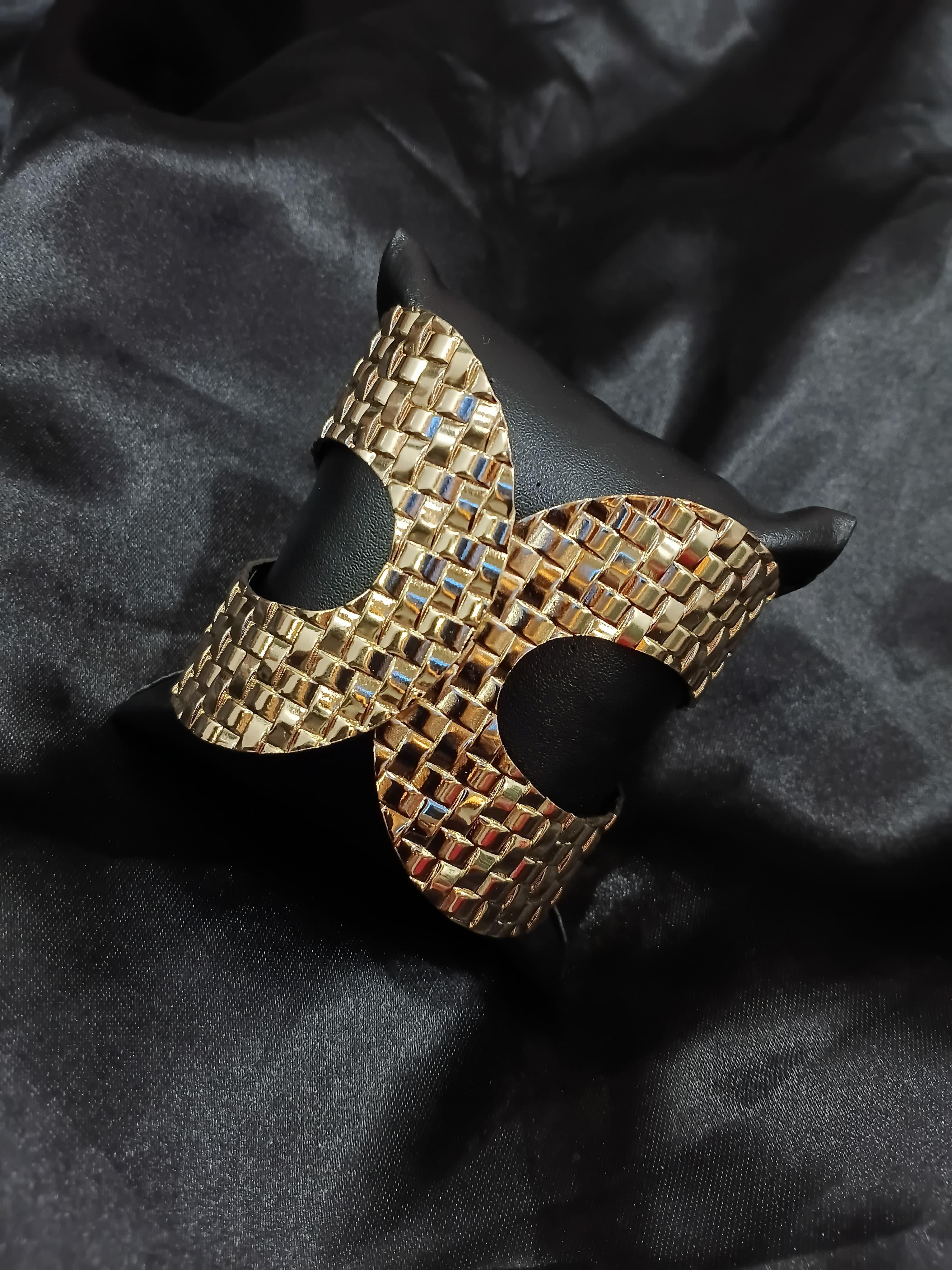 Expertly crafted from high-grade alloy and finished in a high-gloss 22K gold polish, the bracelet gives off a mirror-like shine, while the raised grid pattern catches and reflects light for a dazzling effect. Its open-back design ensures an easy fit, making it both elegant and practical.
