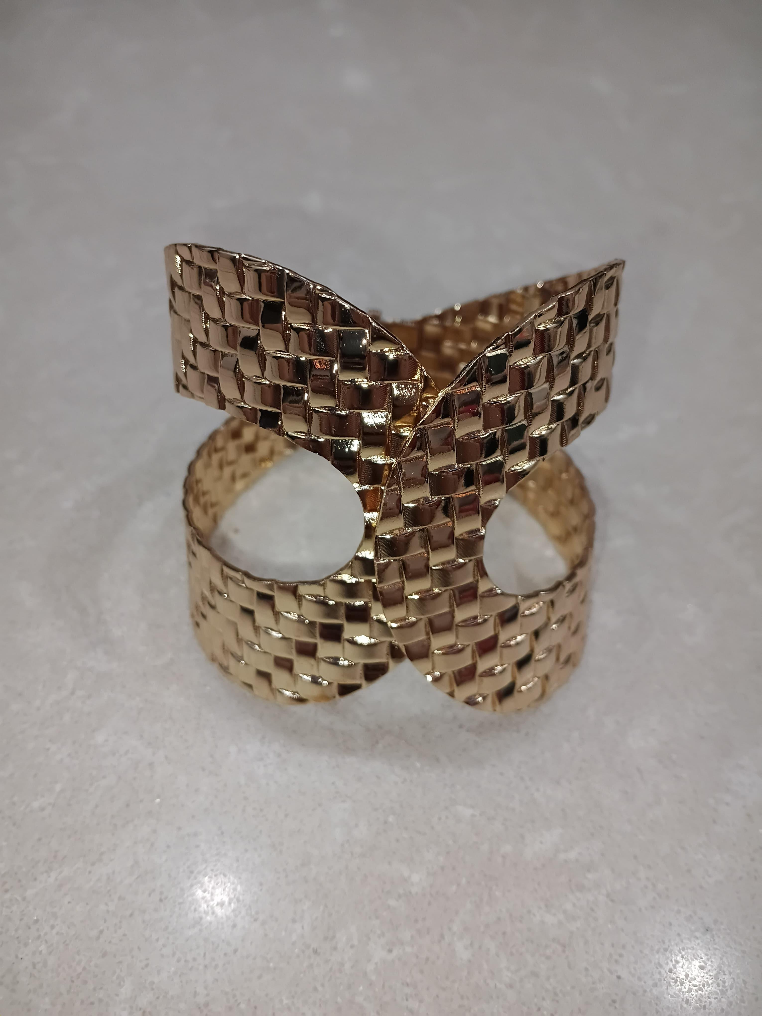 Gracefully bold and undeniably distinctive, the Noor Woven Gold Statement Cuff is a true conversation starter. With its luxurious basket-weave texture and sculptural silhouette, this cuff is a modern reinterpretation of traditional artistry. The design features a bold butterfly-shaped cutout at the center, adding fluidity and feminine charm to the structure.
