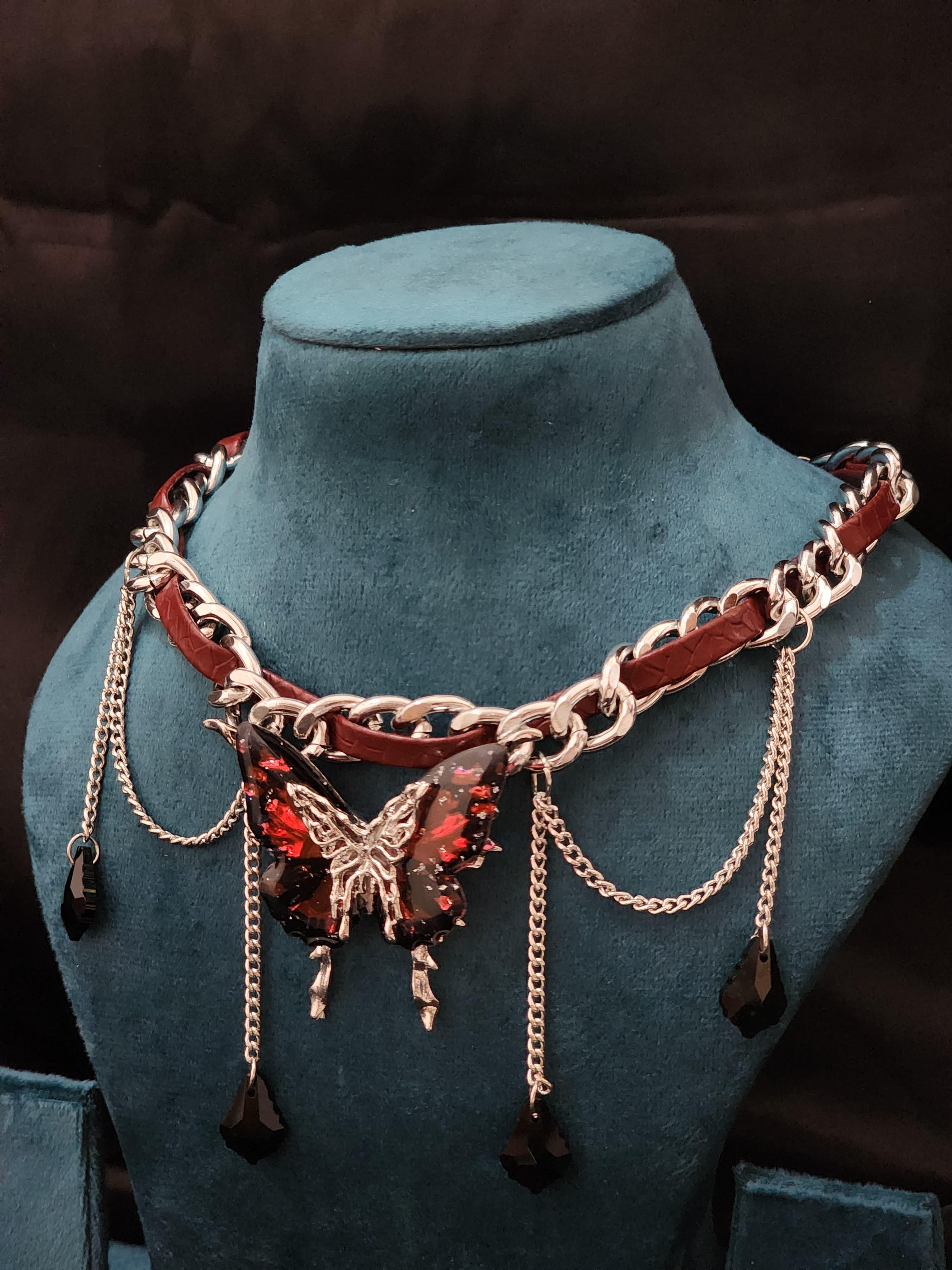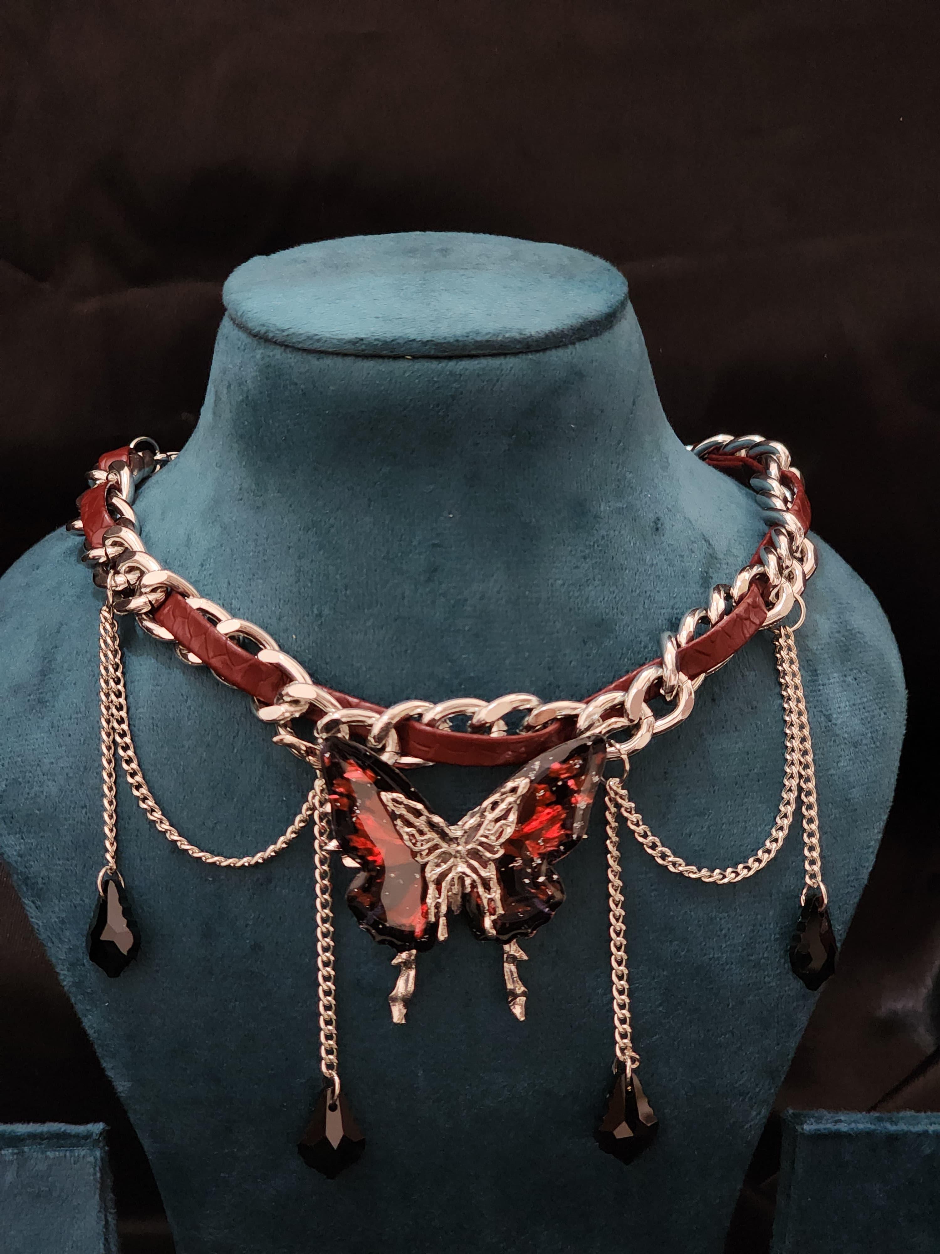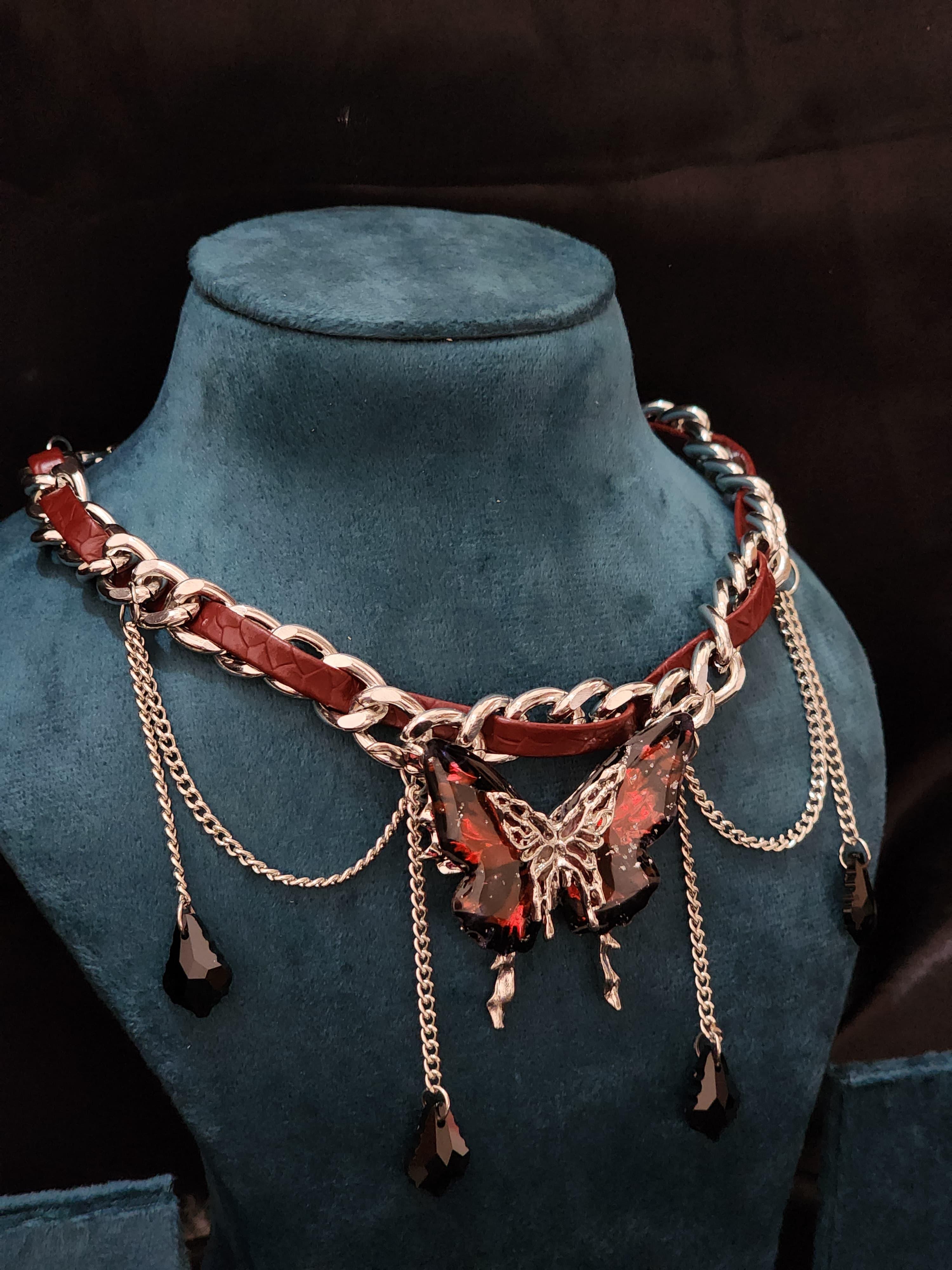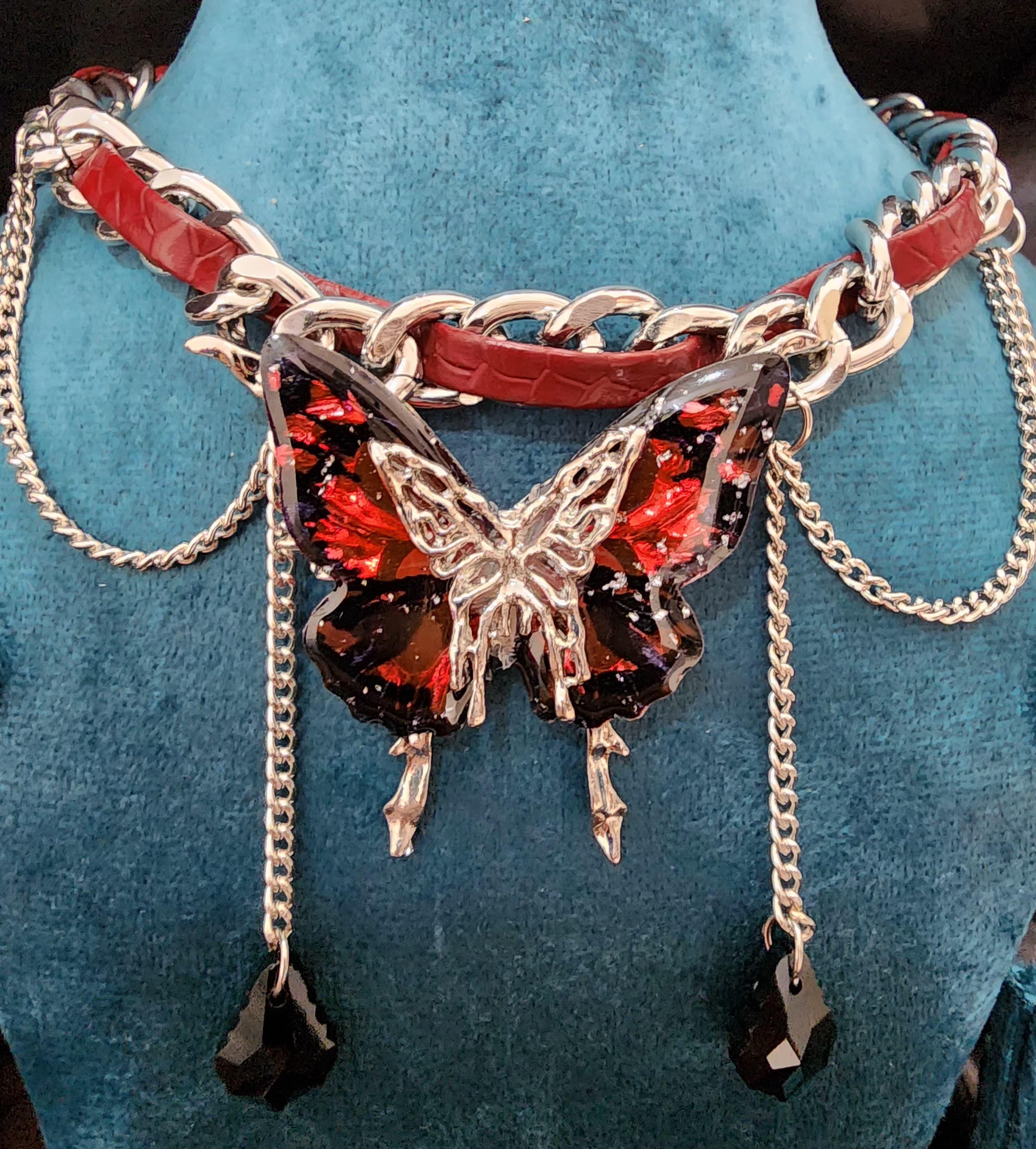 This one-of-a-kind choker features a rich burgundy faux leather strap intricately woven with a chunky silver-tone chain, offering both strength and allure. At the heart of the design is a dazzling three-dimensional butterfly centerpiece crafted in a dramatic mix of deep crimson and black crystal wings, encased in sculpted silver metalwork.
