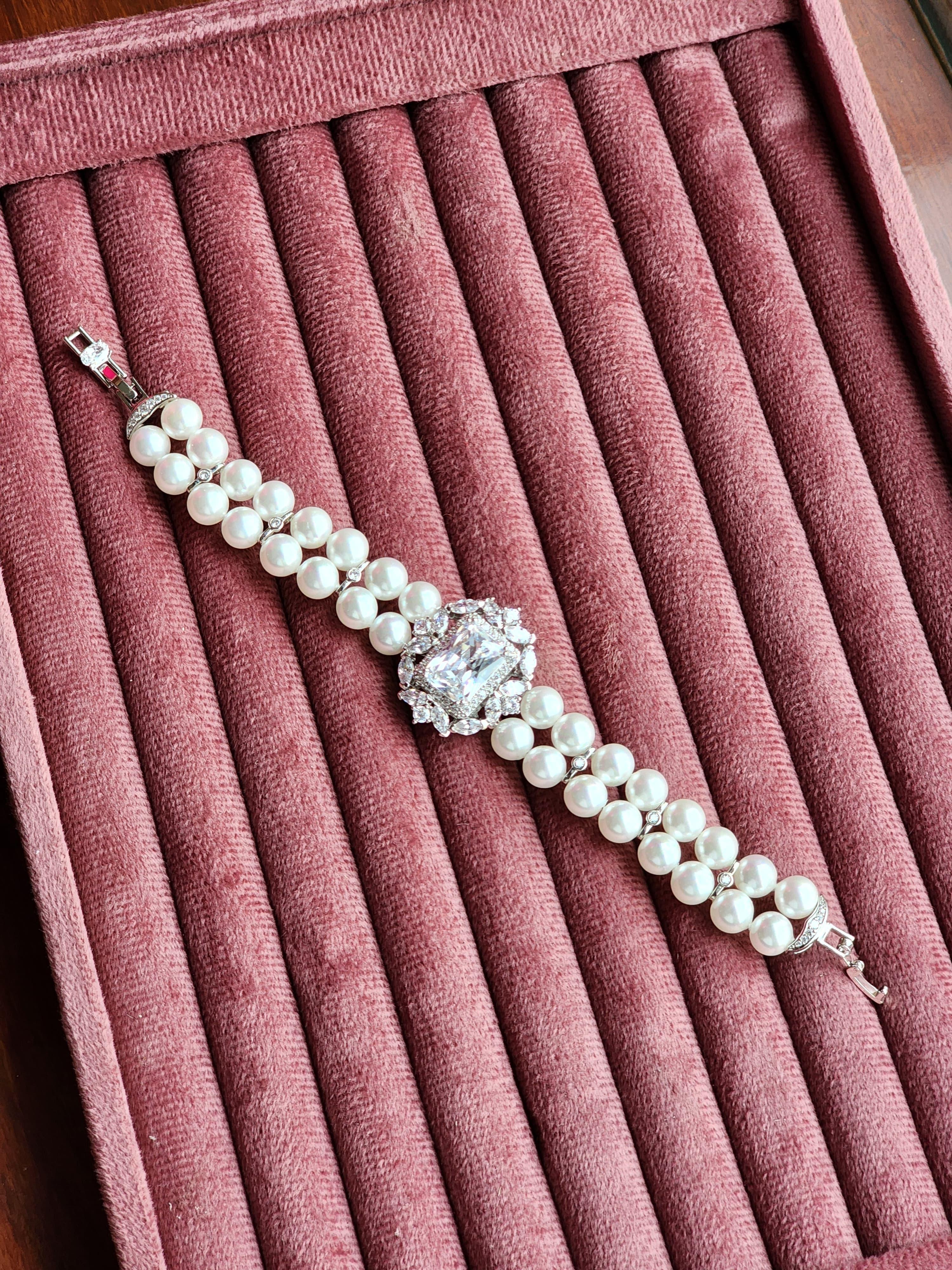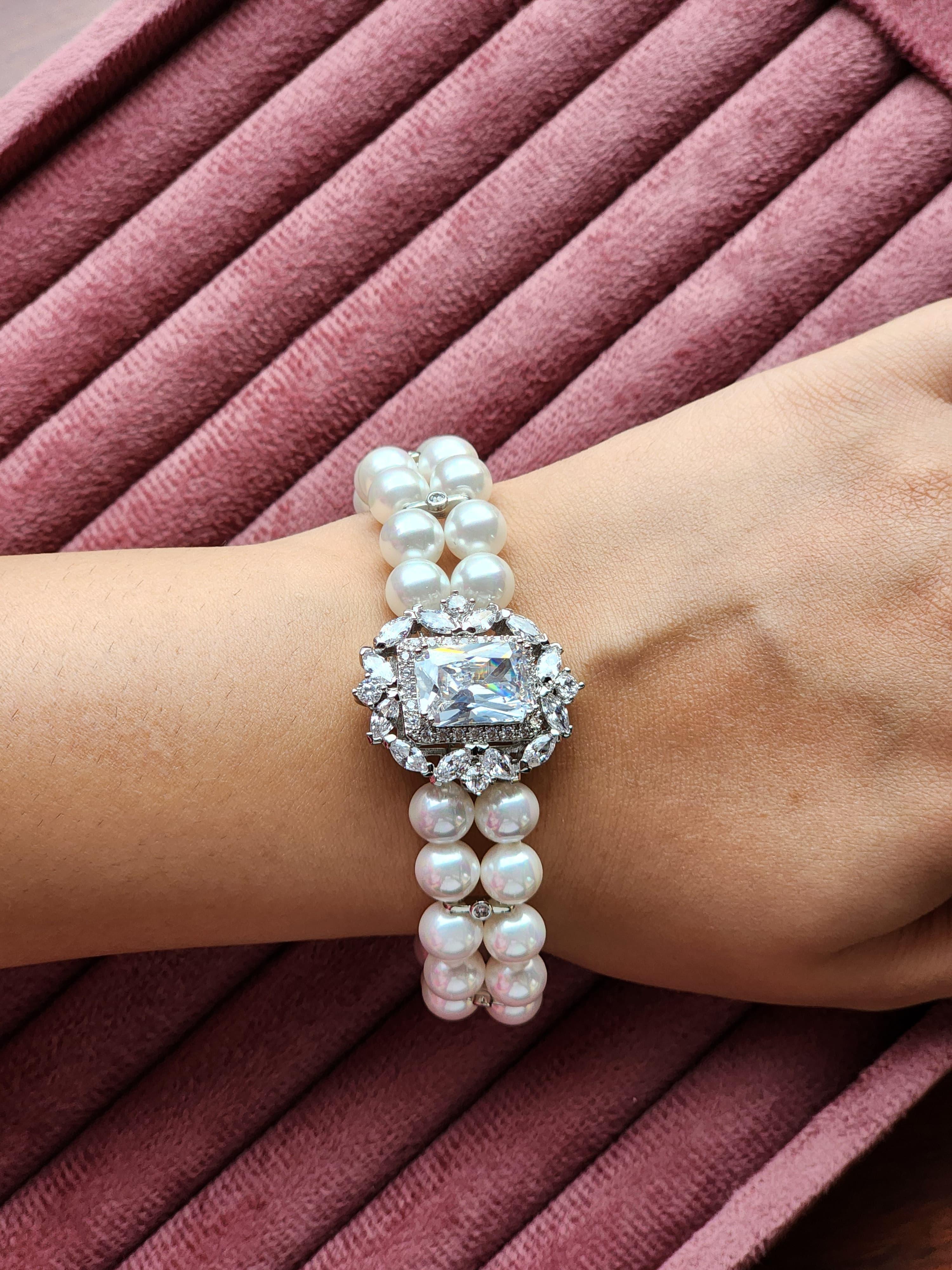 Evoke timeless elegance with the Pearl Éclat Crystal Charm Bracelet by Luxe Aabhushan, a piece designed to capture the grace of a bygone era with a modern sparkle. Featuring a double row of lustrous imitation pearls, this bracelet is the epitome of classic luxury, elevated by a breathtaking central crystal embellishment that exudes sophistication.