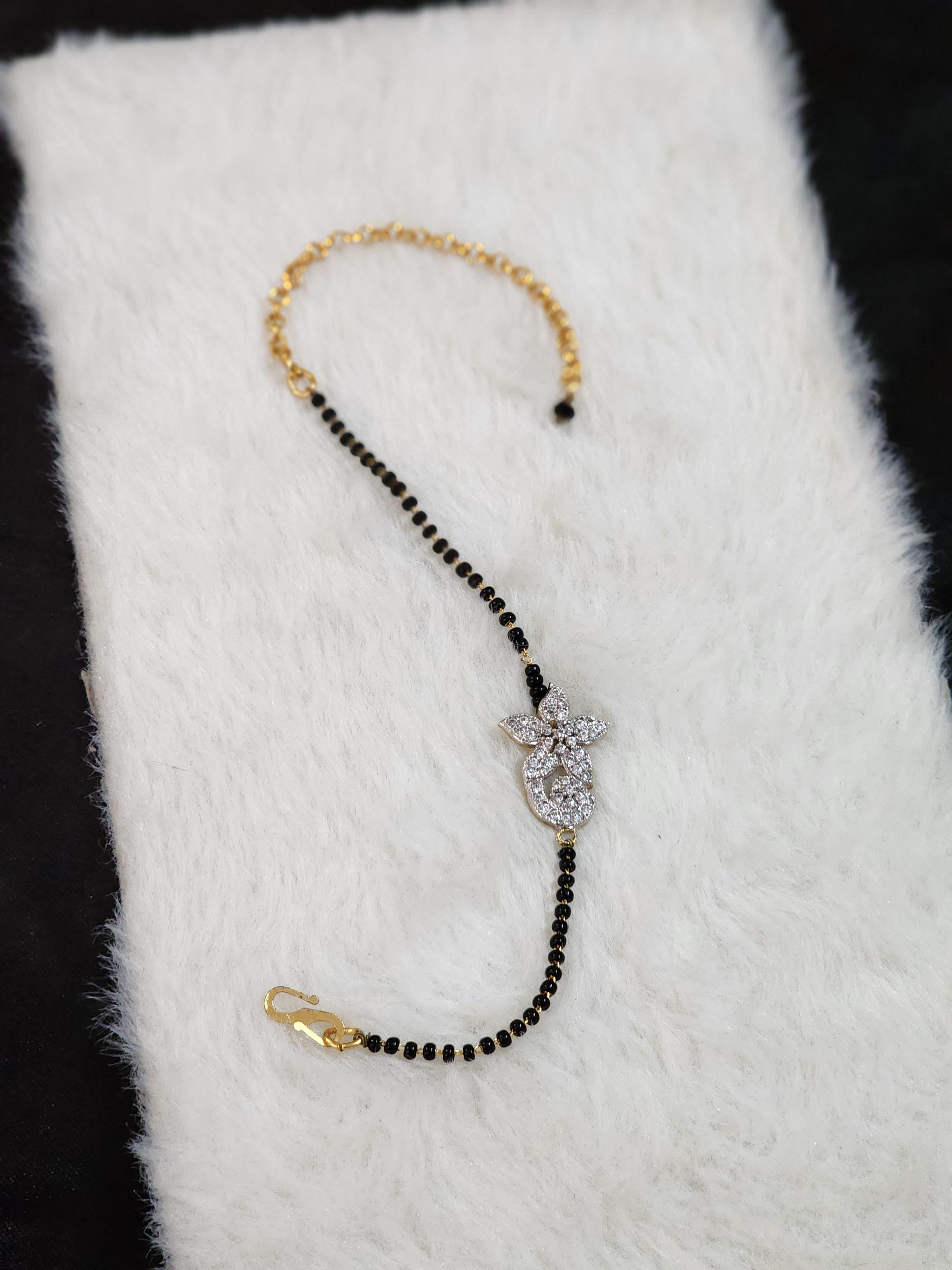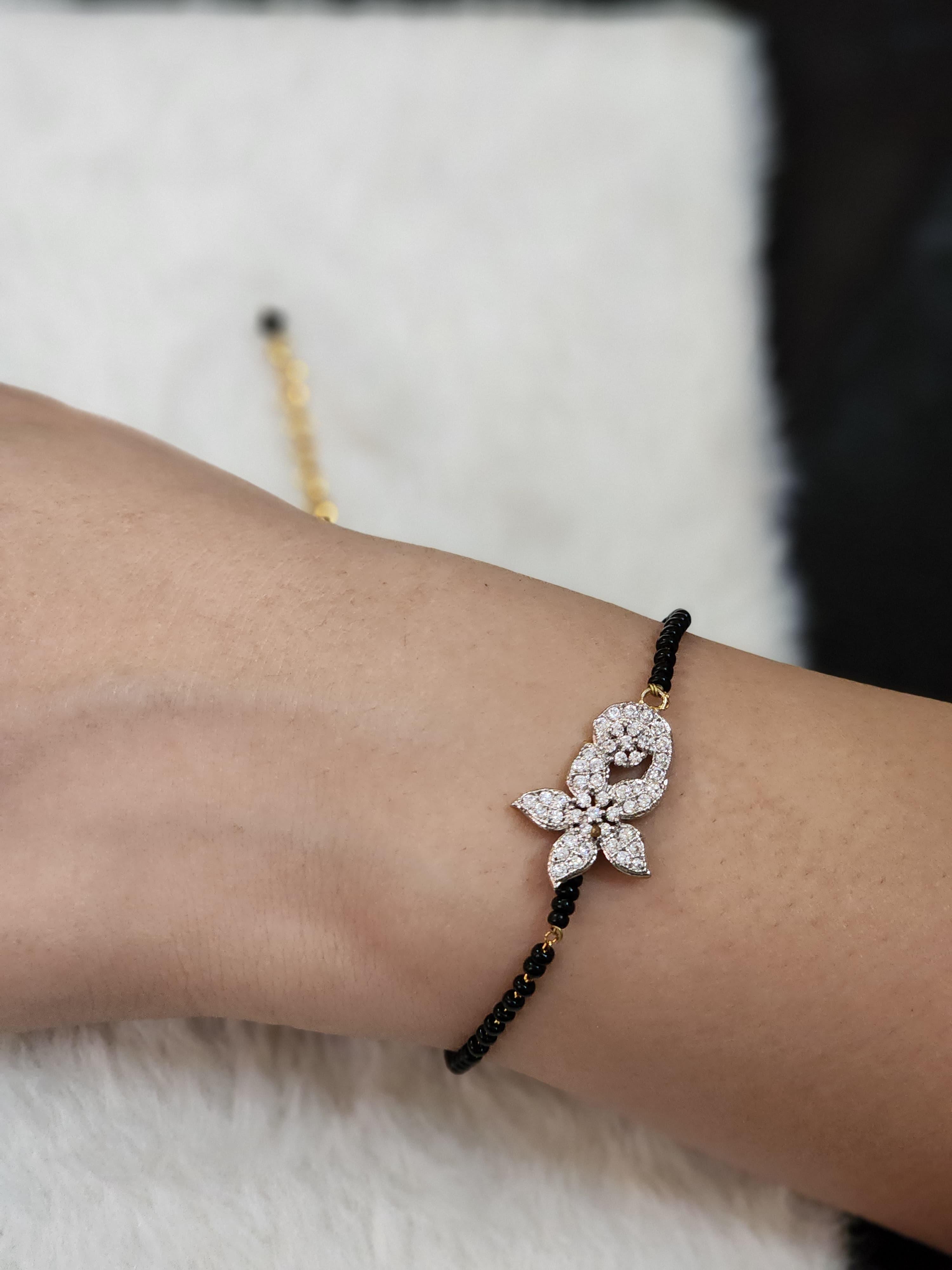 This elegant bracelet features a dazzling floral centerpiece, encrusted with high-shine cubic zirconia (CZ) stones set in a silver-finish motif. On either side, classic black mangalsutra beads flow into a combination of gold-toned textured chain and a secure hook closure. The flower design symbolizes purity and new beginnings, making it a meaningful and stylish addition to your jewellery collection.