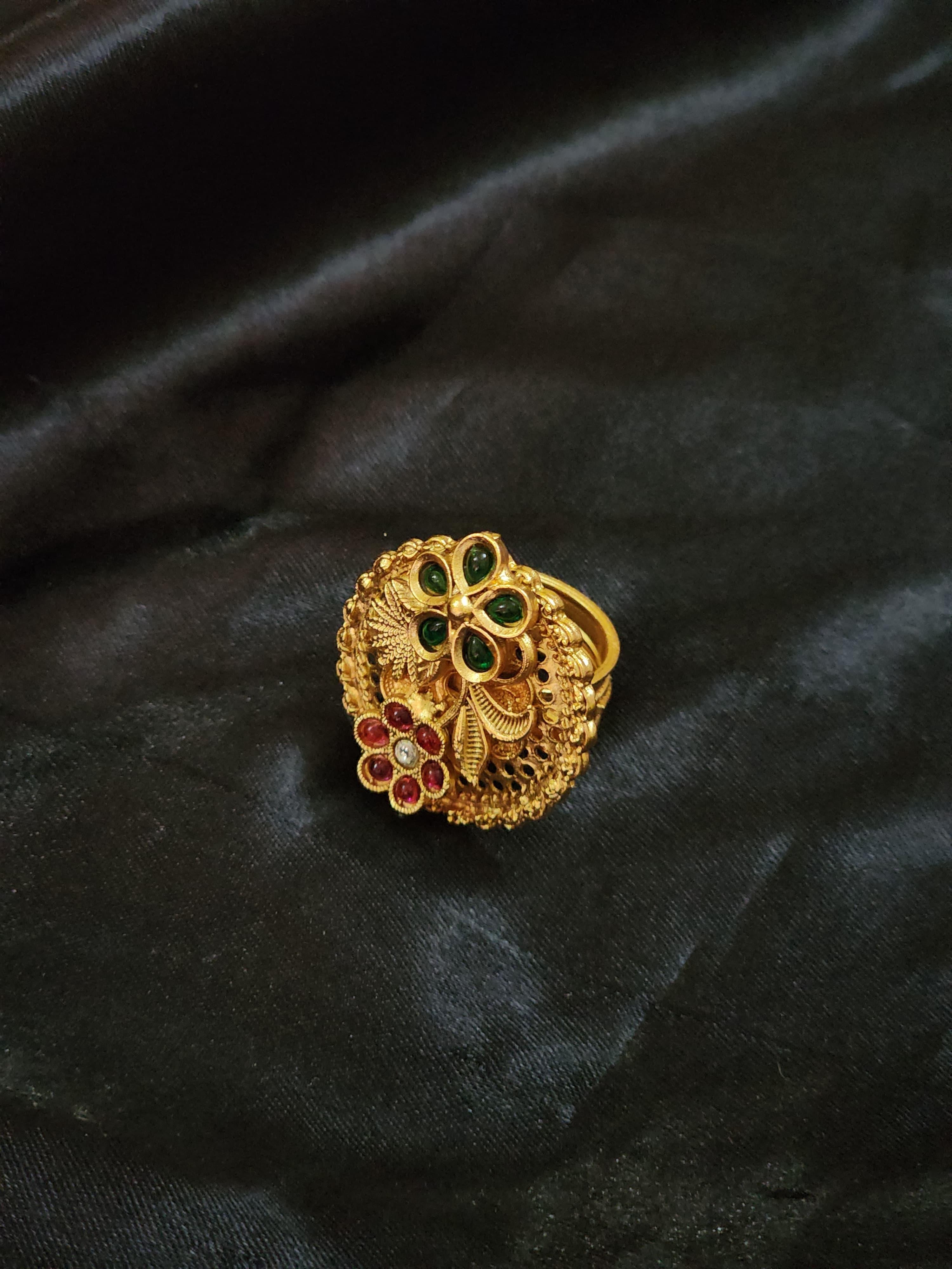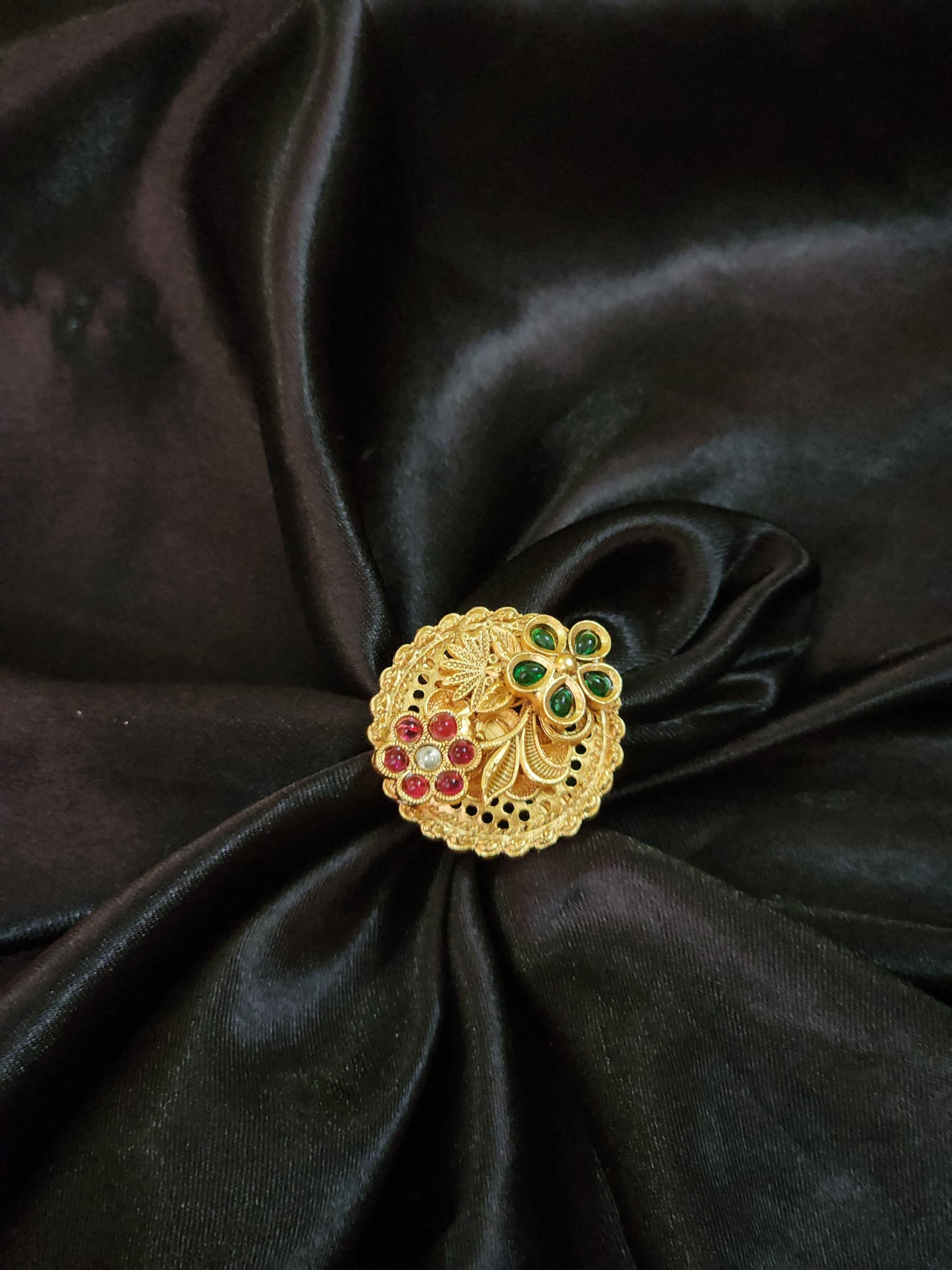 Crafted in a beautifully detailed filigree gold-toned base, the design features ornate peacock-feather-inspired engravings accented with clusters of radiant gemstones. One half is embellished with a graceful trio of green enamel stones forming a floral motif, while the other showcases a contrasting bouquet of ruby-toned pink stones – symbolizing prosperity and passion.