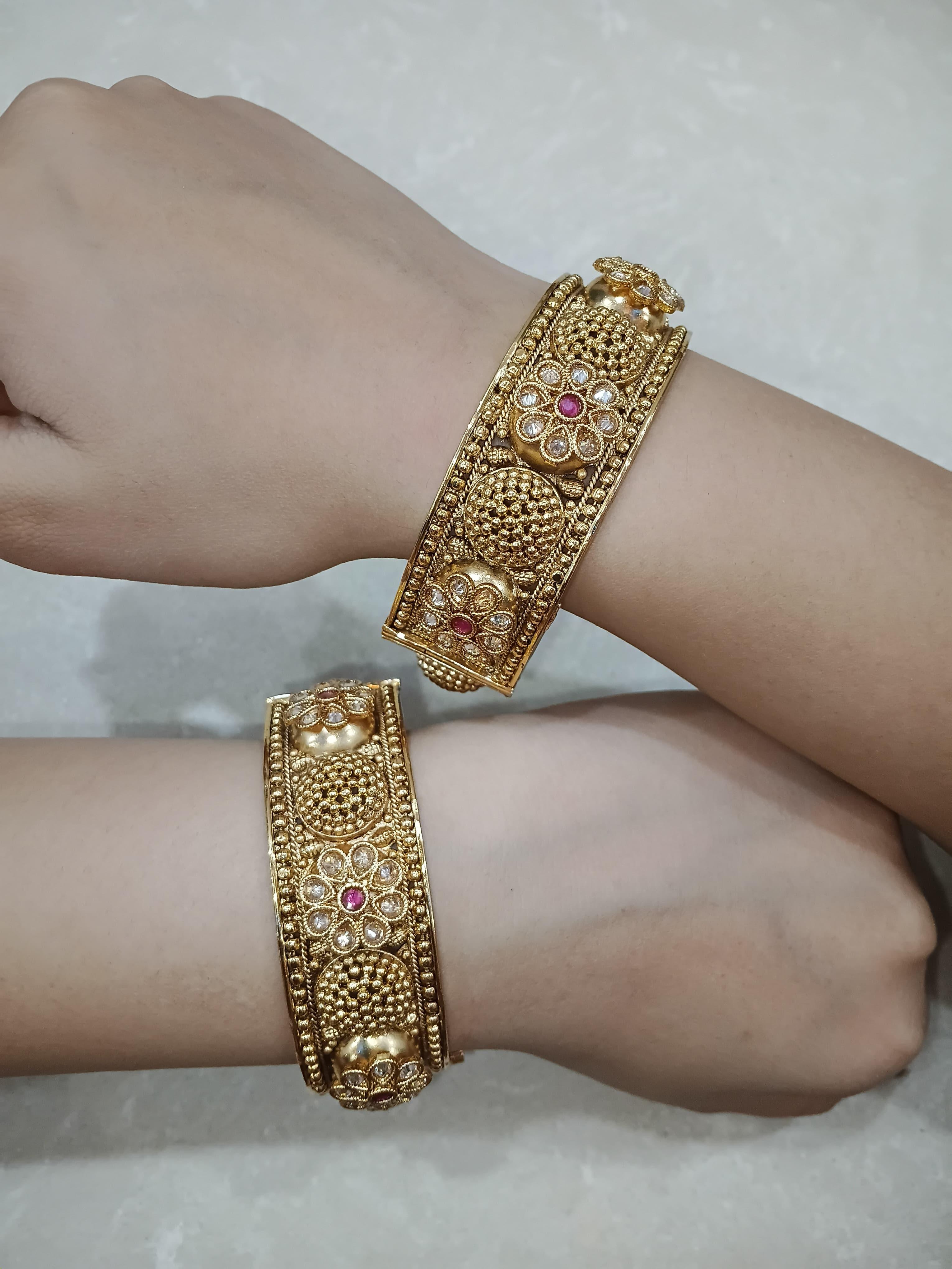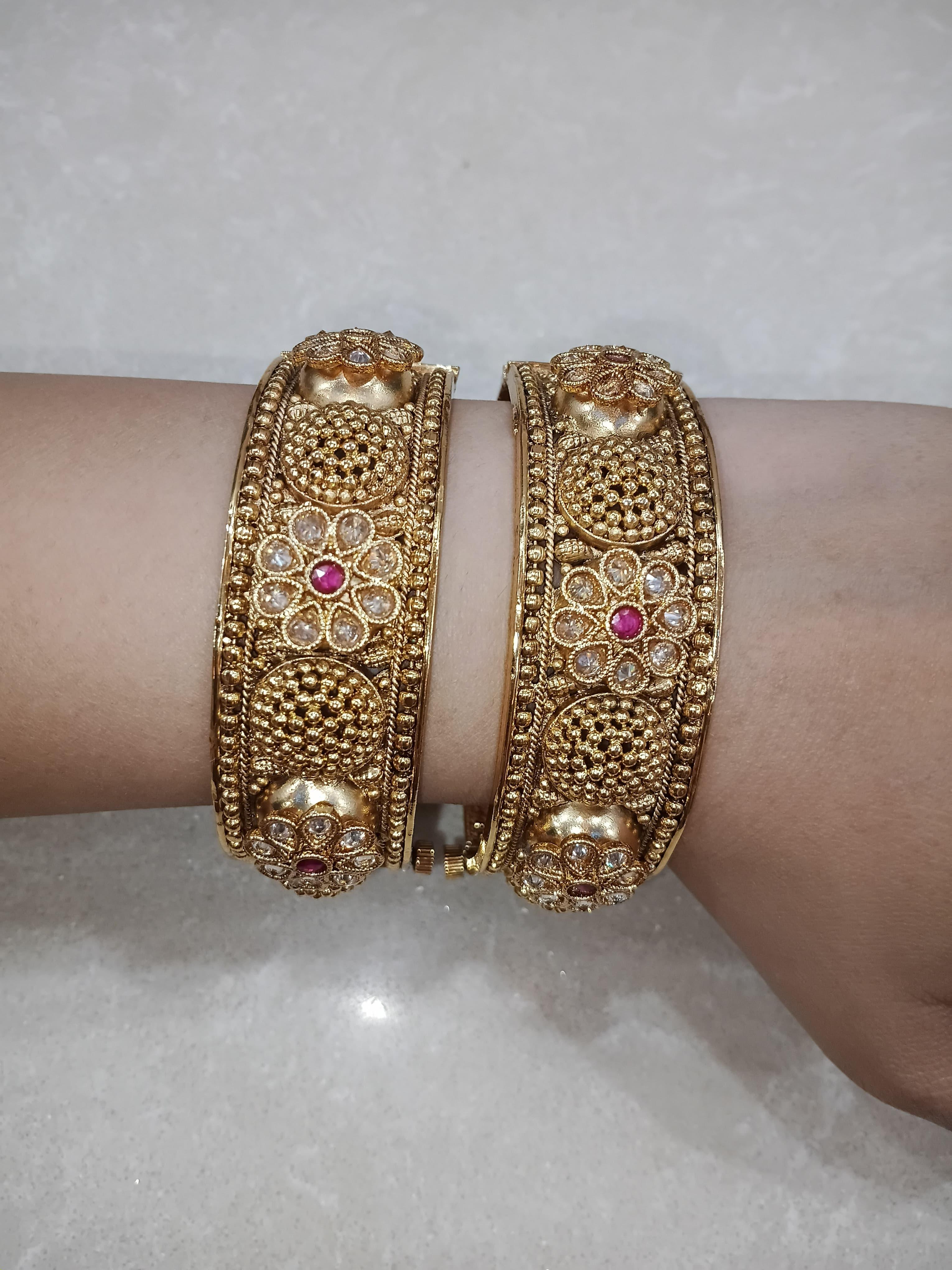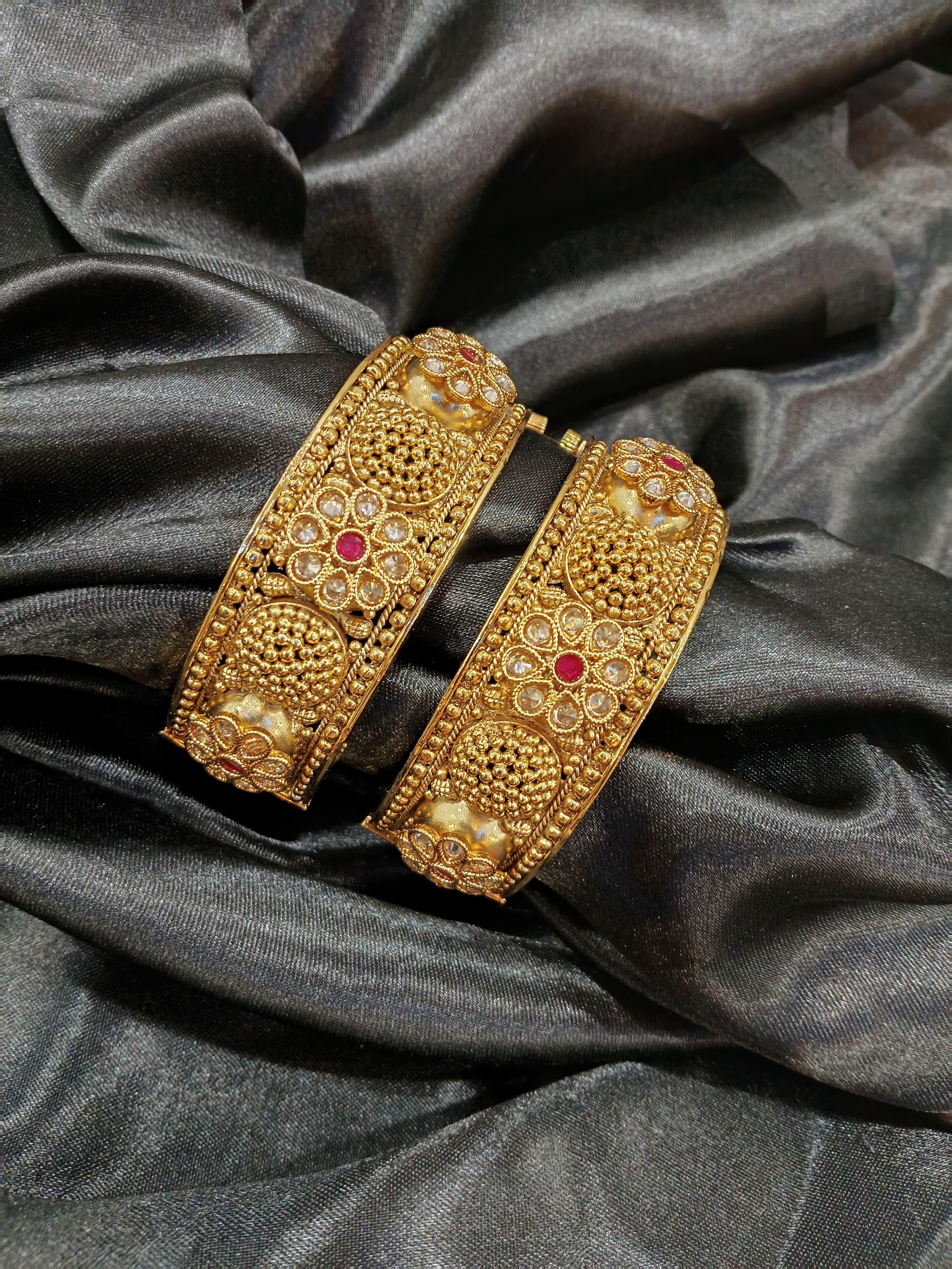 This bold bangle set features an intricately carved temple-style design adorned with antique gold textures and raised motifs. Circular domes, floral clusters, and traditional beadwork come together in perfect symmetry, giving the bangles a vintage yet timeless appeal. Red and white AD (American Diamond) stones are carefully embedded in floral patterns, creating a striking contrast against the antique gold finish.