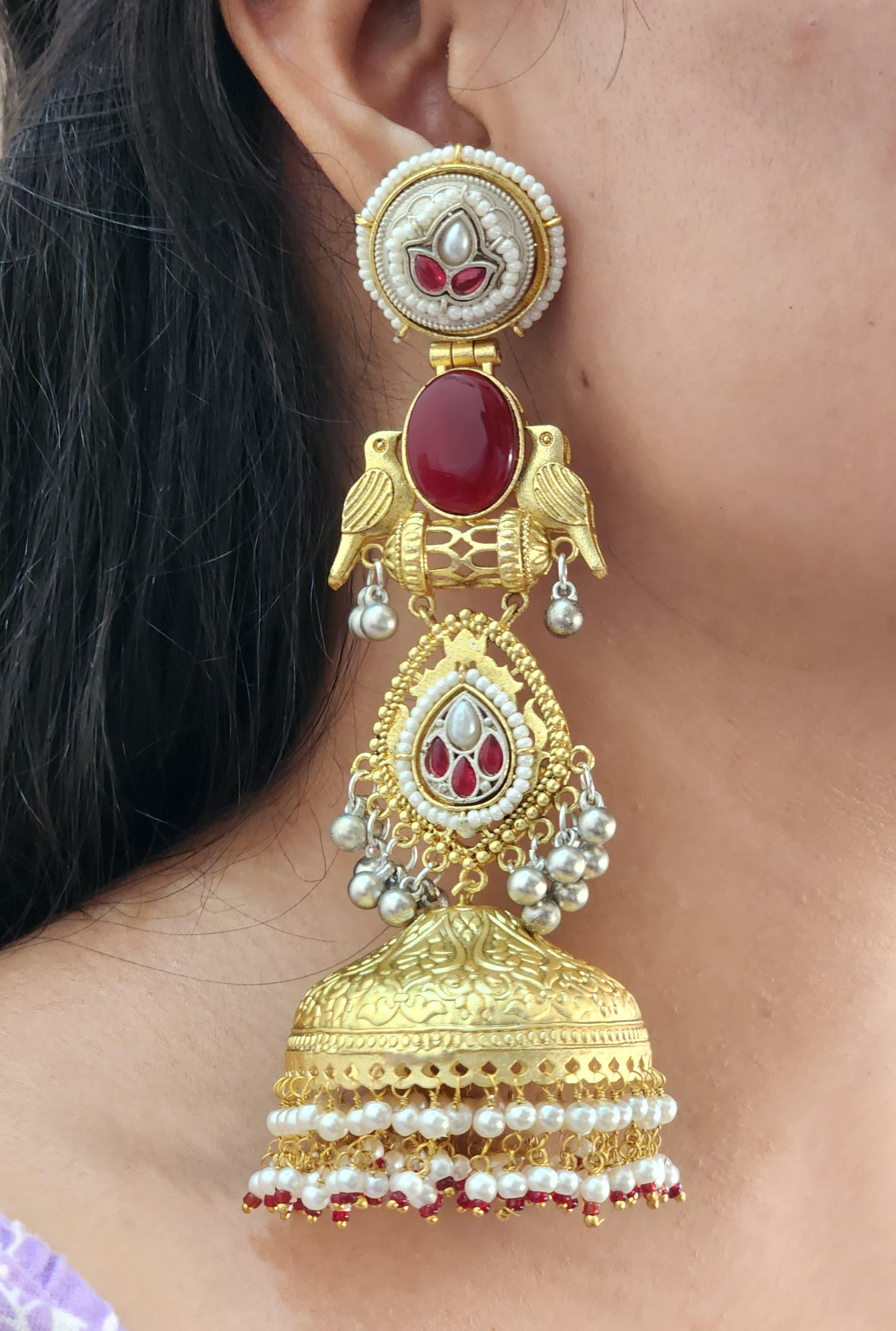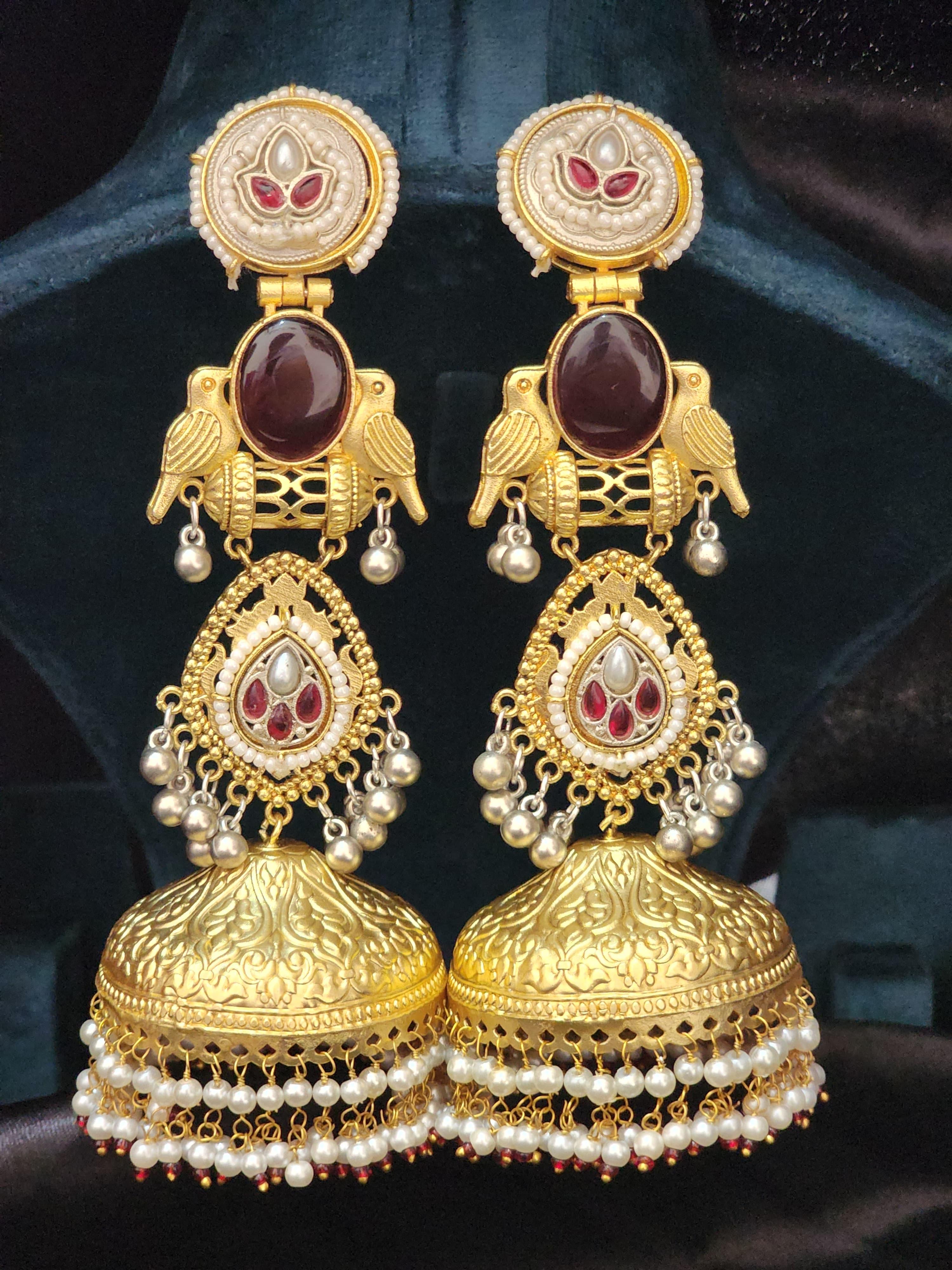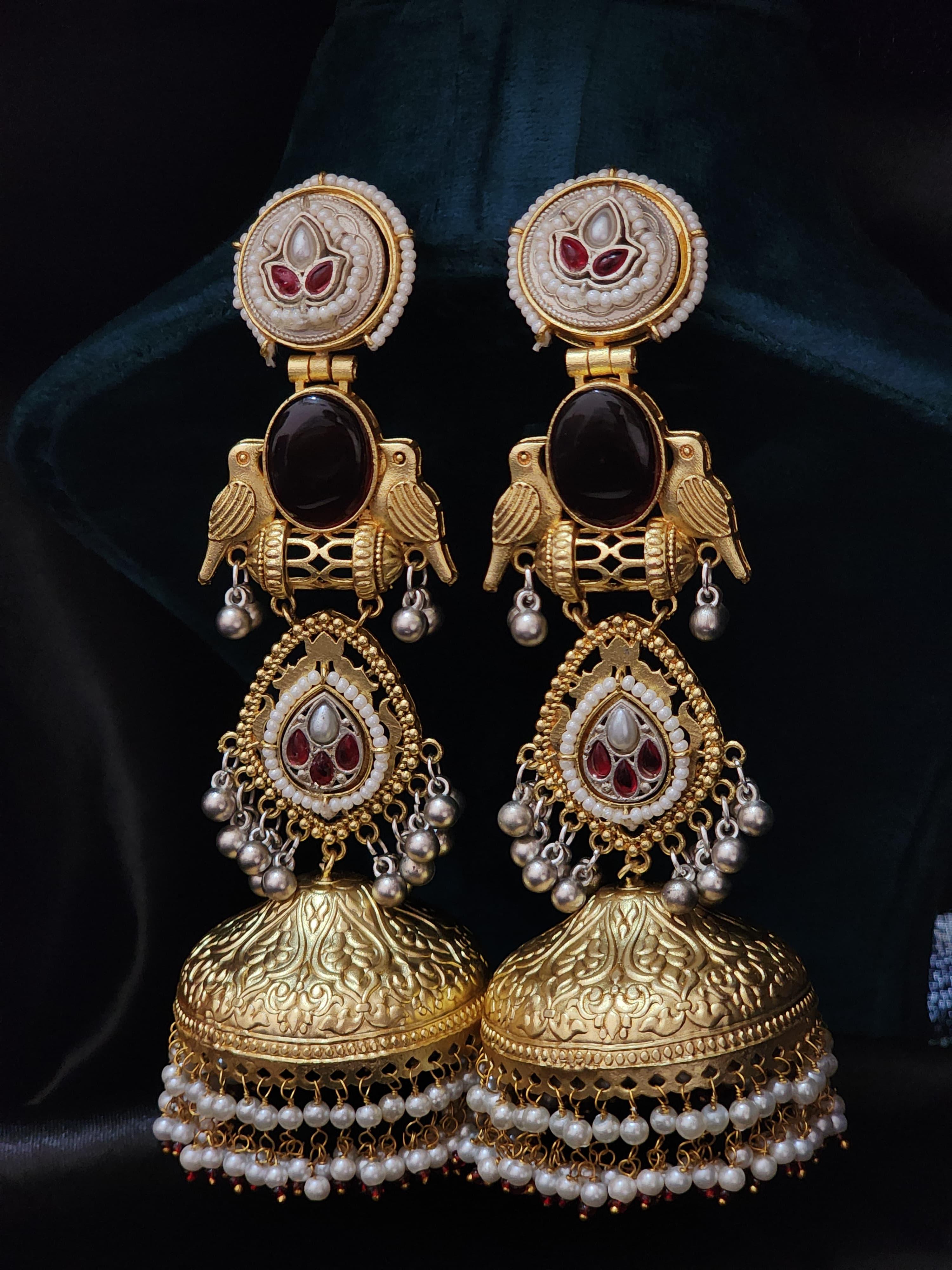 The top stud features a refined floral motif encased with lustrous faux pearls and delicate red kundan stones that captivate the light. The central panel is adorned with a rich deep-toned cabochon set in a radiant gold-plated base, flanked by intricate bird motifs — a symbol of beauty and grace. The beautifully crafted drop centerpiece, encrusted with kundan and beads, adds depth and character to the pair.
