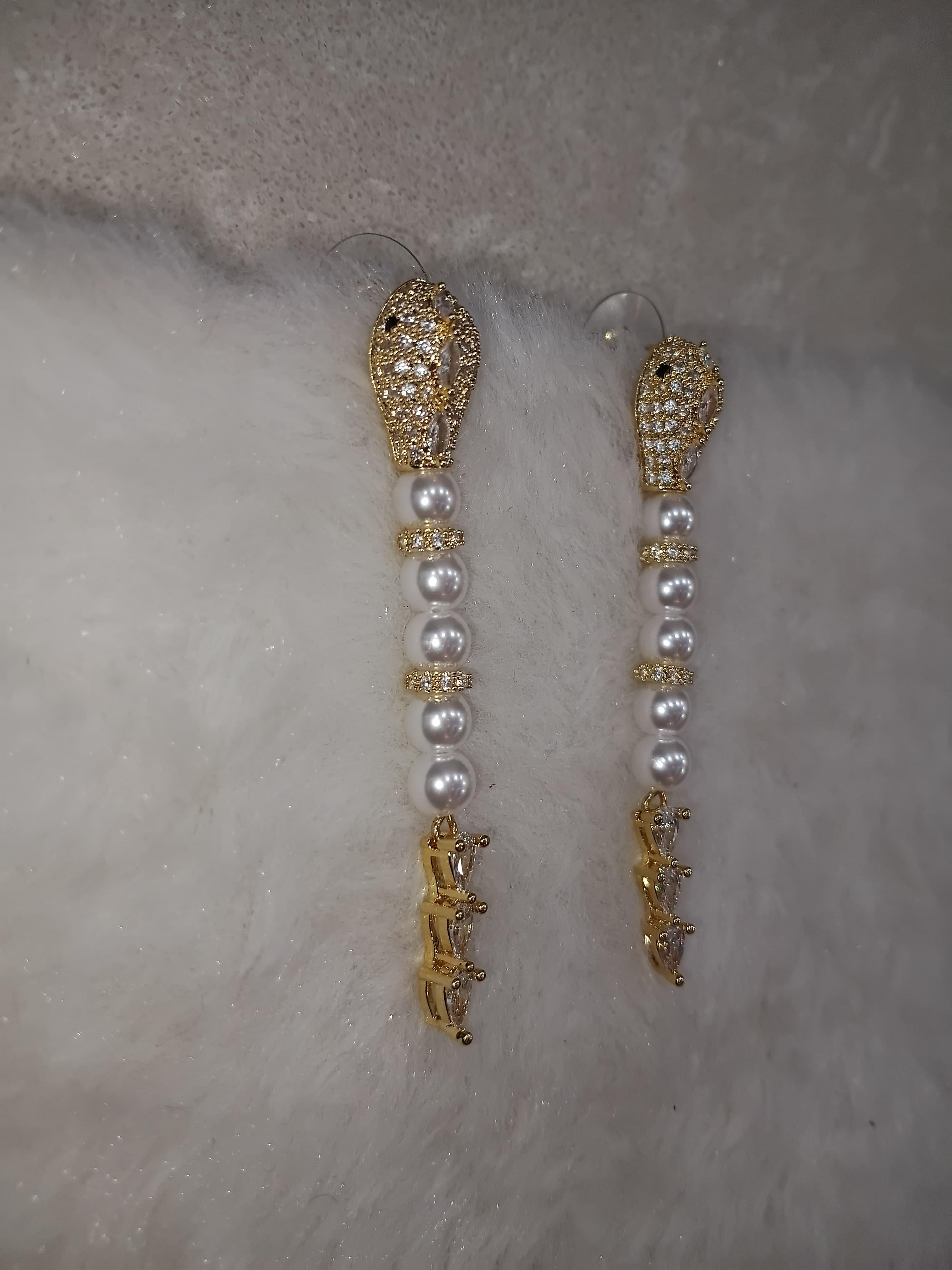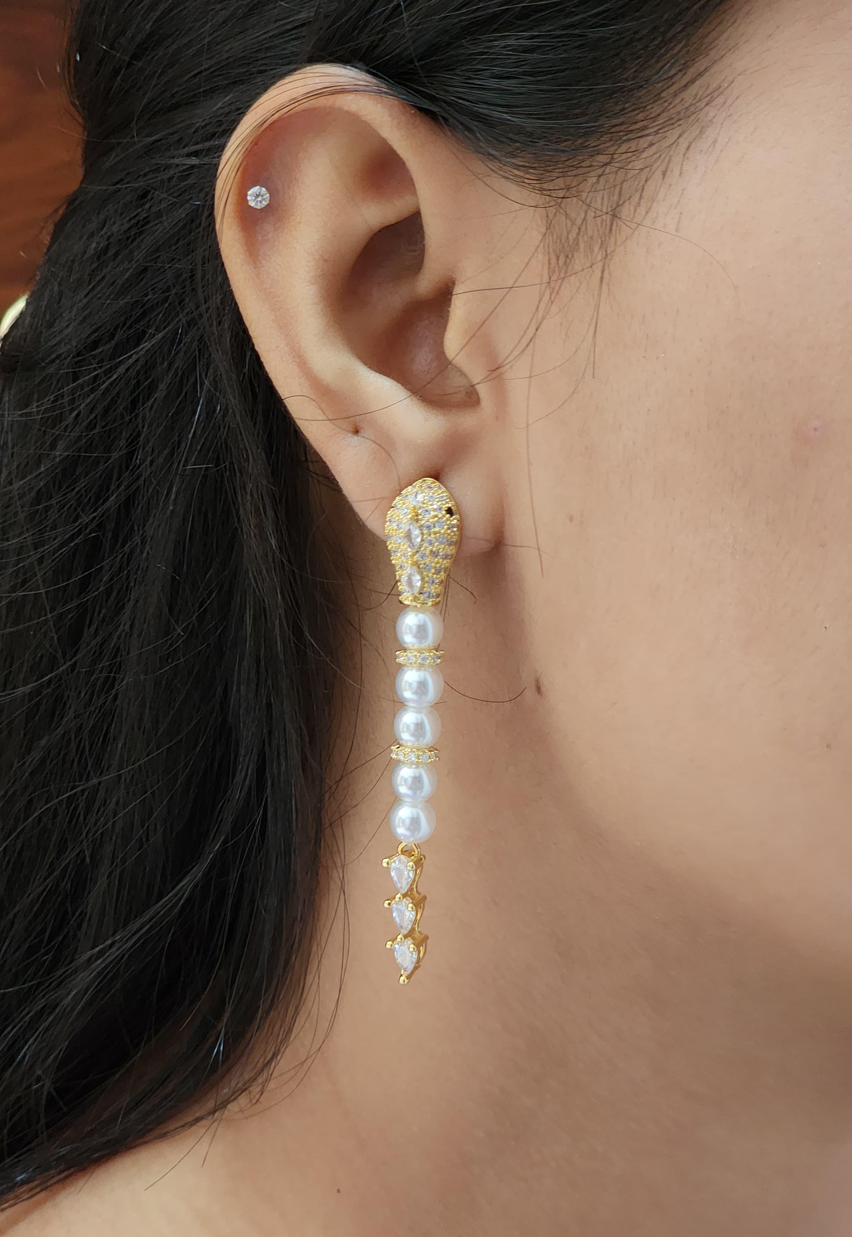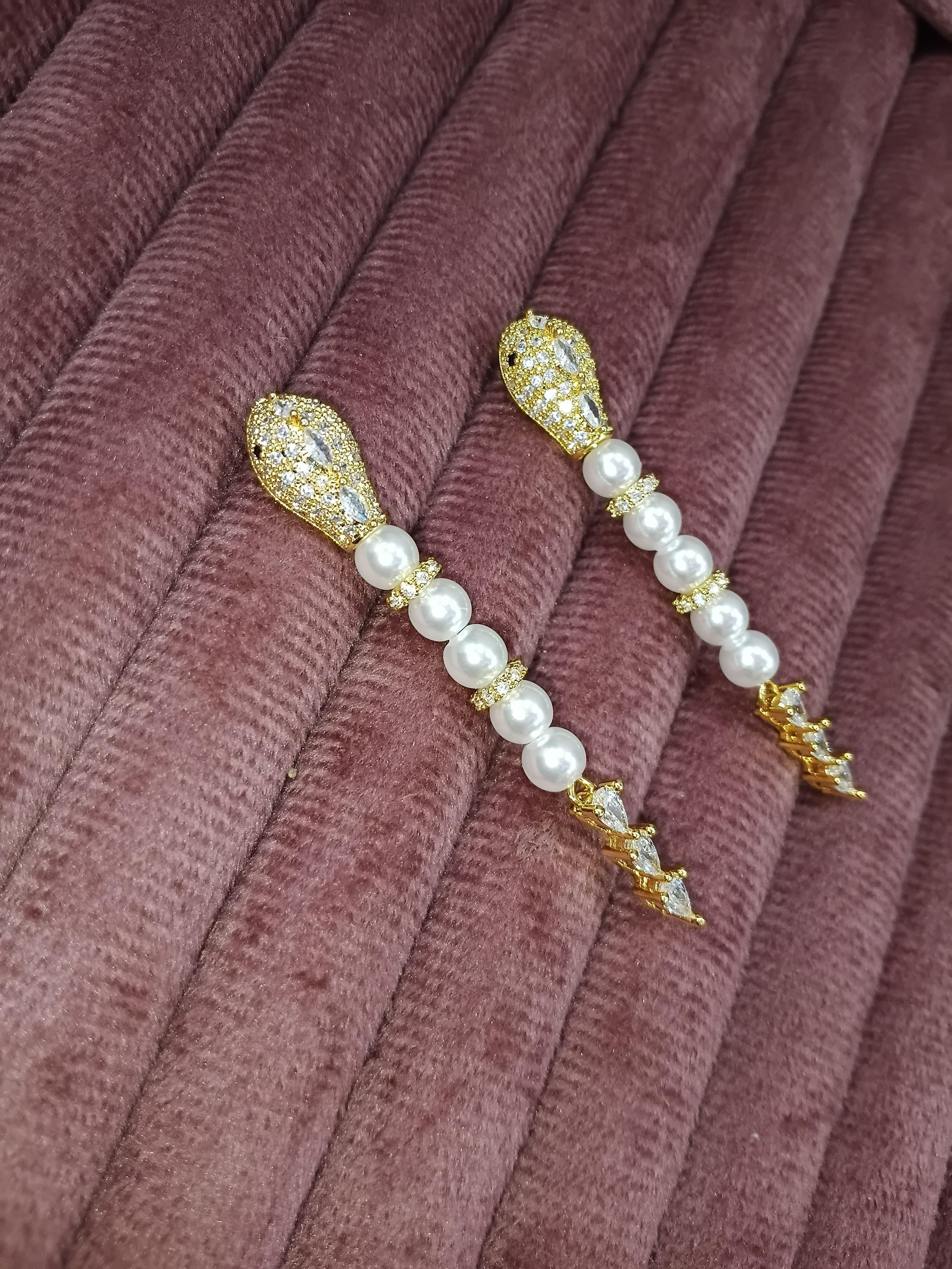 Timeless sophistication meets modern glamour in our Regal Pearl Cascade Drop Earrings, exclusively curated by Luxe Aabhushan. Featuring a graceful vertical alignment of lustrous synthetic pearls, these earrings are enhanced with a dazzling gold-toned base, encrusted with micro CZ diamonds and teardrop-shaped American diamonds for an opulent finish.