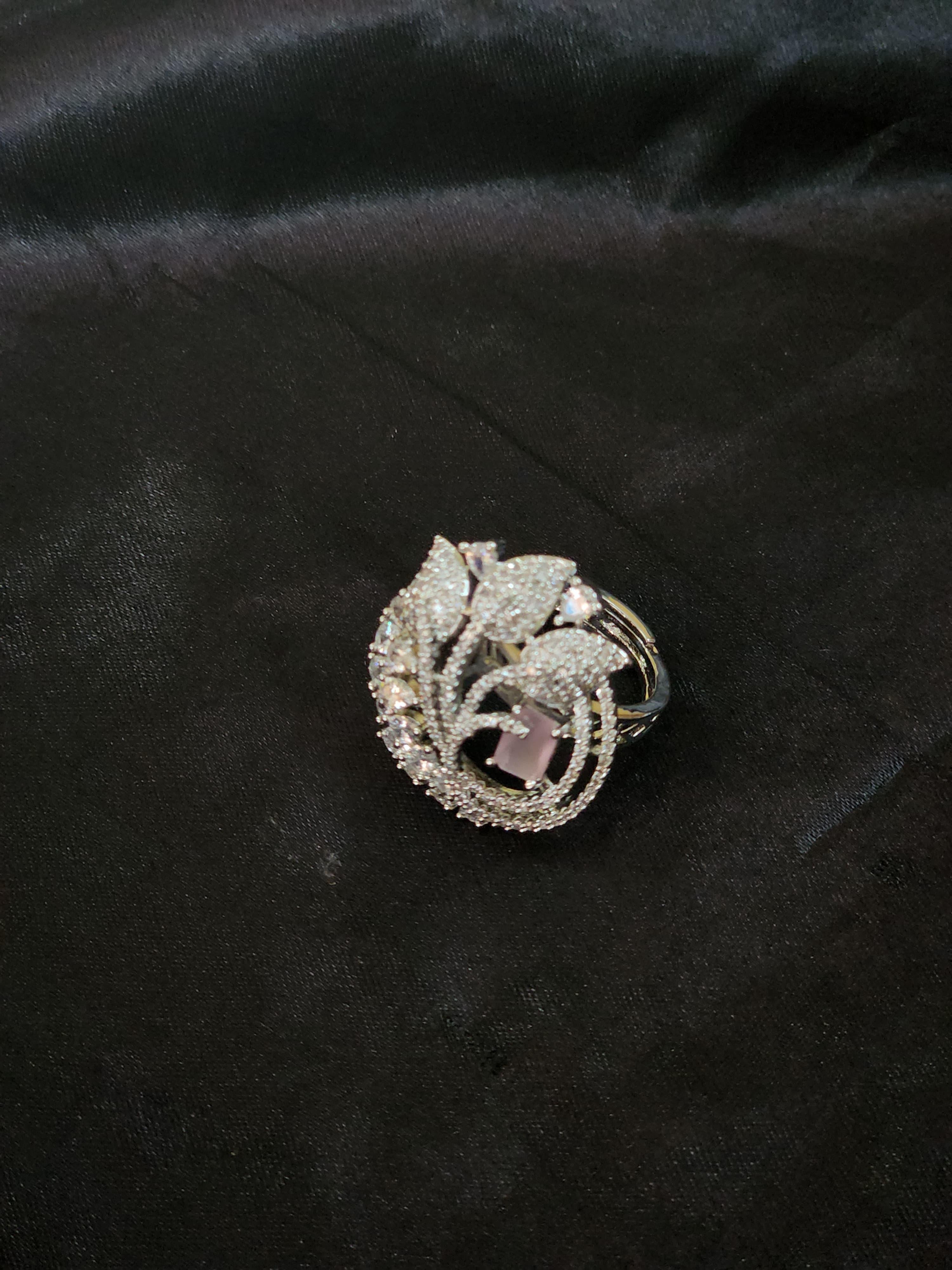 At its center lies a delicate blush-pink crystal, beautifully cut and perfectly positioned to add a soft romantic touch. Sculpted leaf motifs and swirling paved curves frame the stone, creating a sophisticated harmony of structure and sparkle.