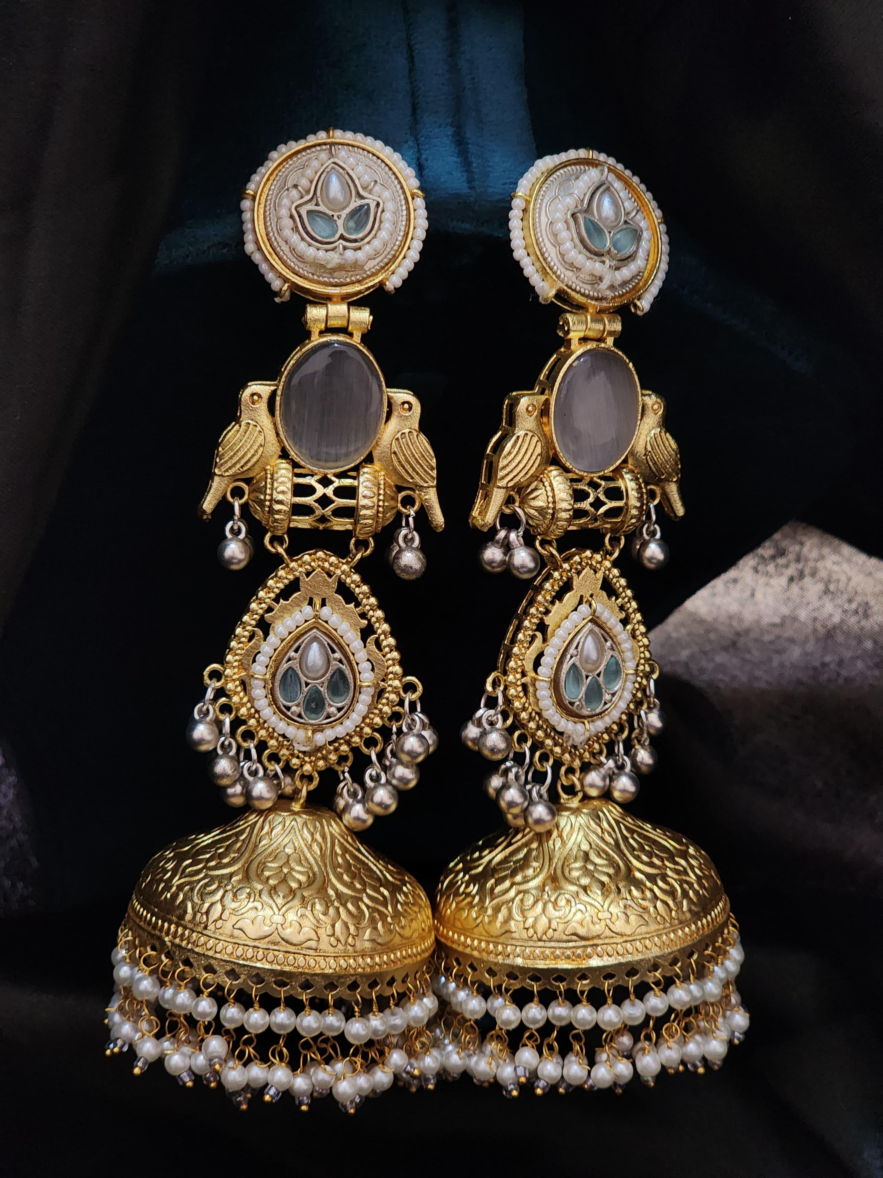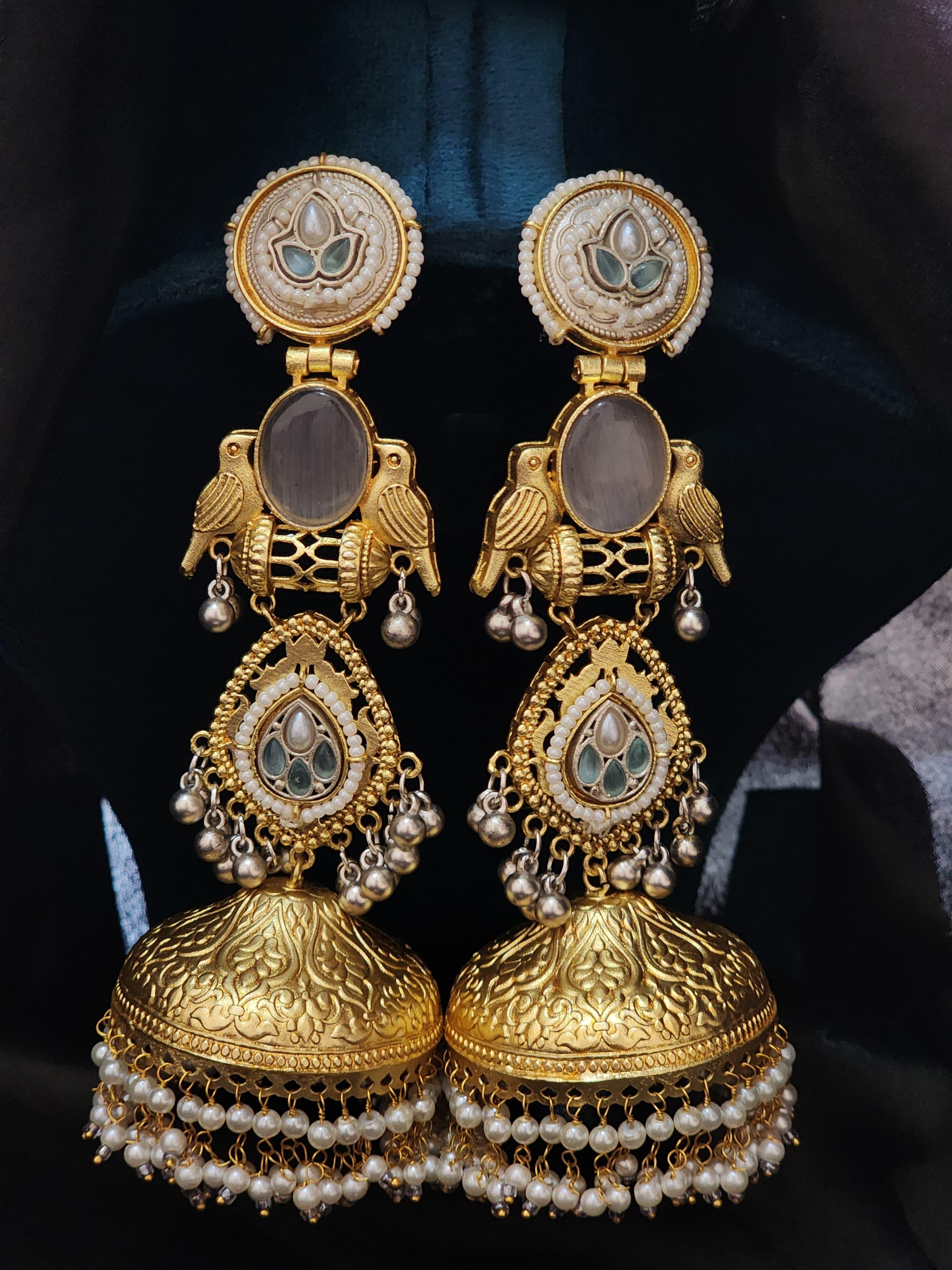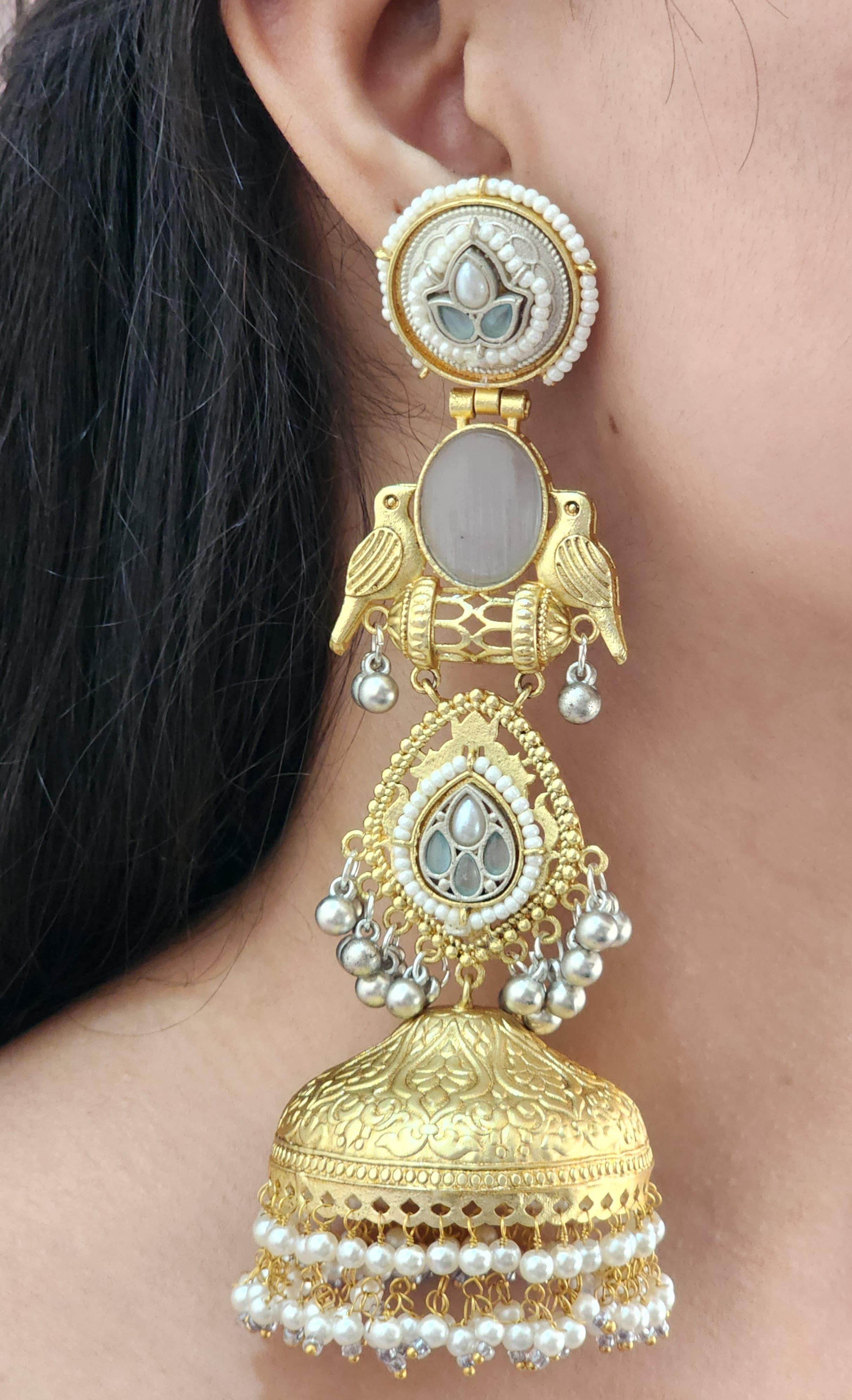 The design begins with an elaborate stud, featuring a hand-embellished floral kundan motif encircled by a ring of delicate seed pearls. Two gracefully sculpted birds, finished in antique gold, form the midsection—adding symbolism of love and harmony. A translucent oval-cut stone at the center lends ethereal balance and adds a soft sheen to the entire piece.