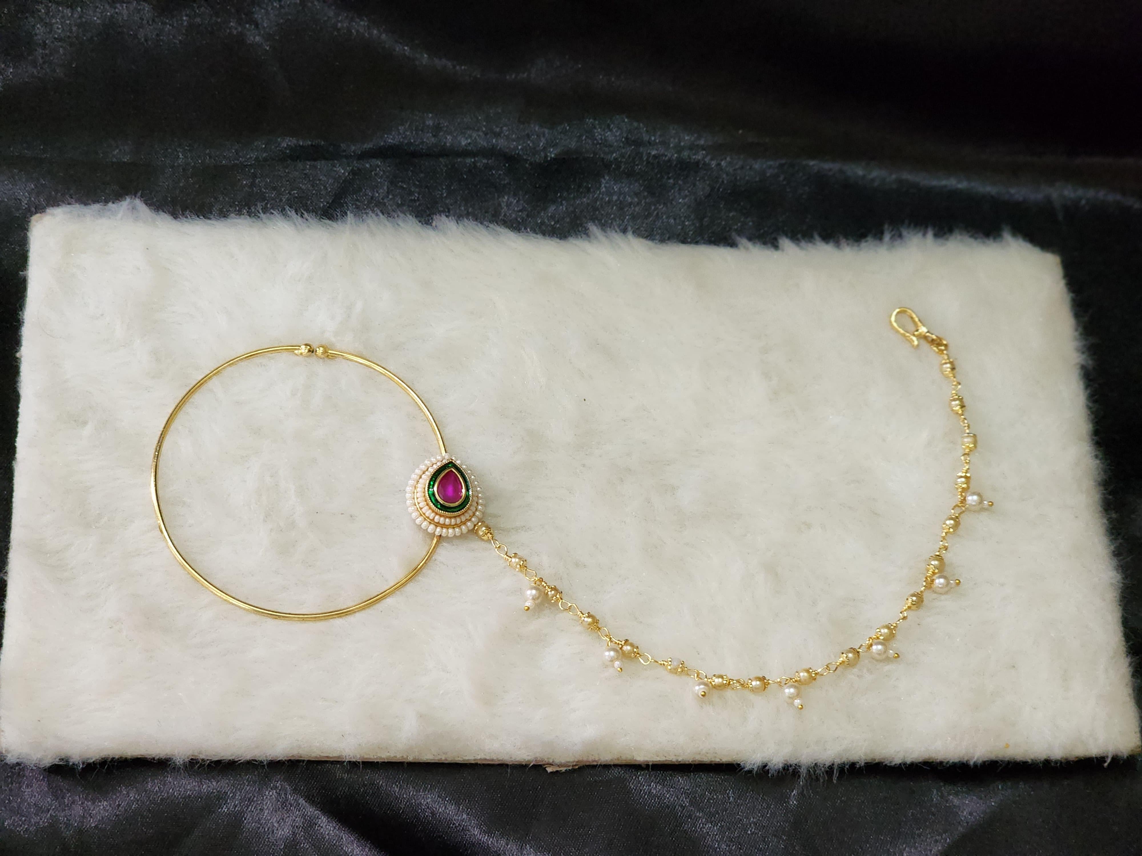 The attached gold-toned beaded chain, embellished with dainty faux pearls, adds an extra layer of grace, making it the perfect accessory to pair with lehengas, sarees, or bridal wear. Lightweight and easy to wear, this statement piece ensures comfort without compromising on elegance.