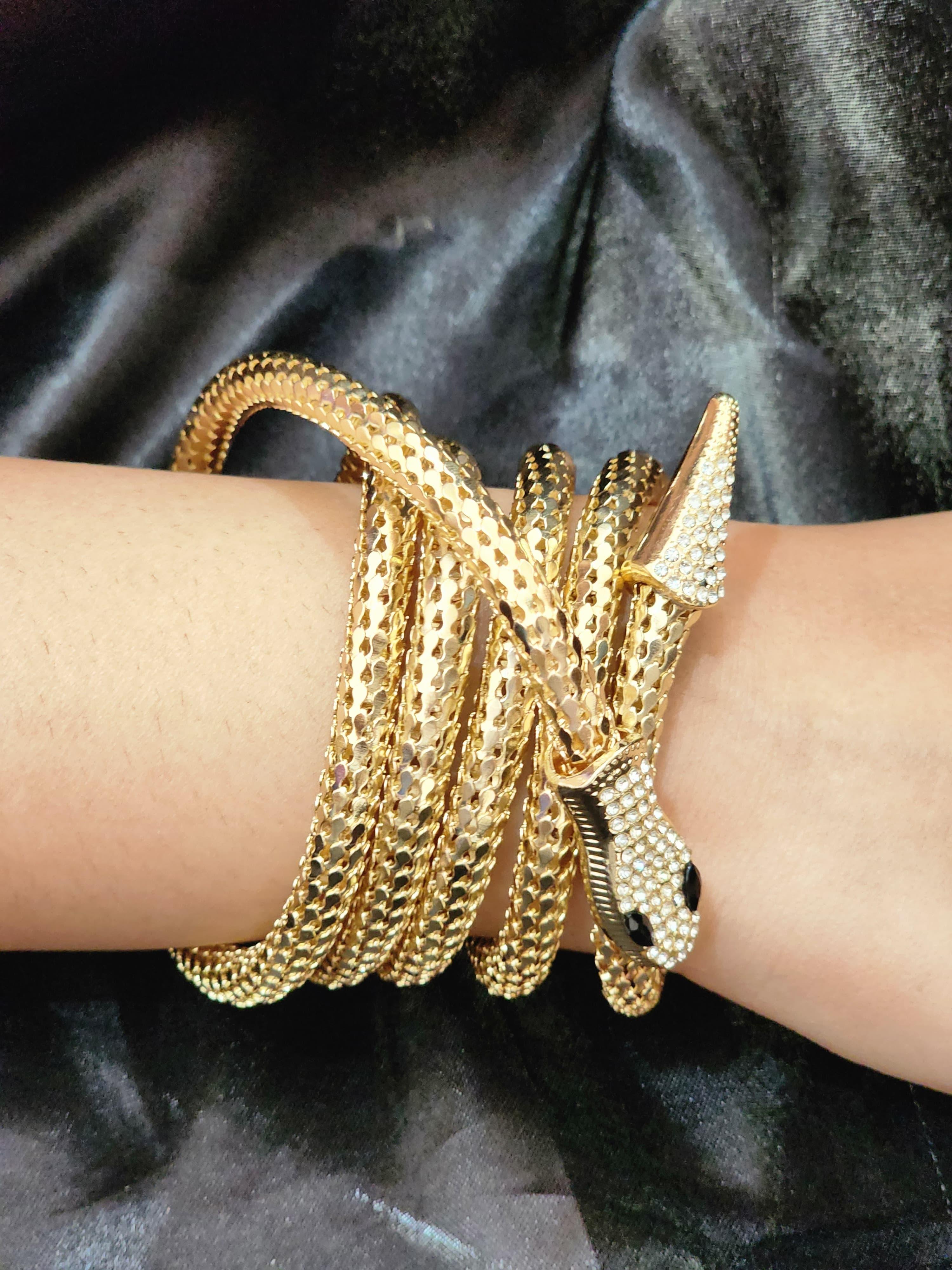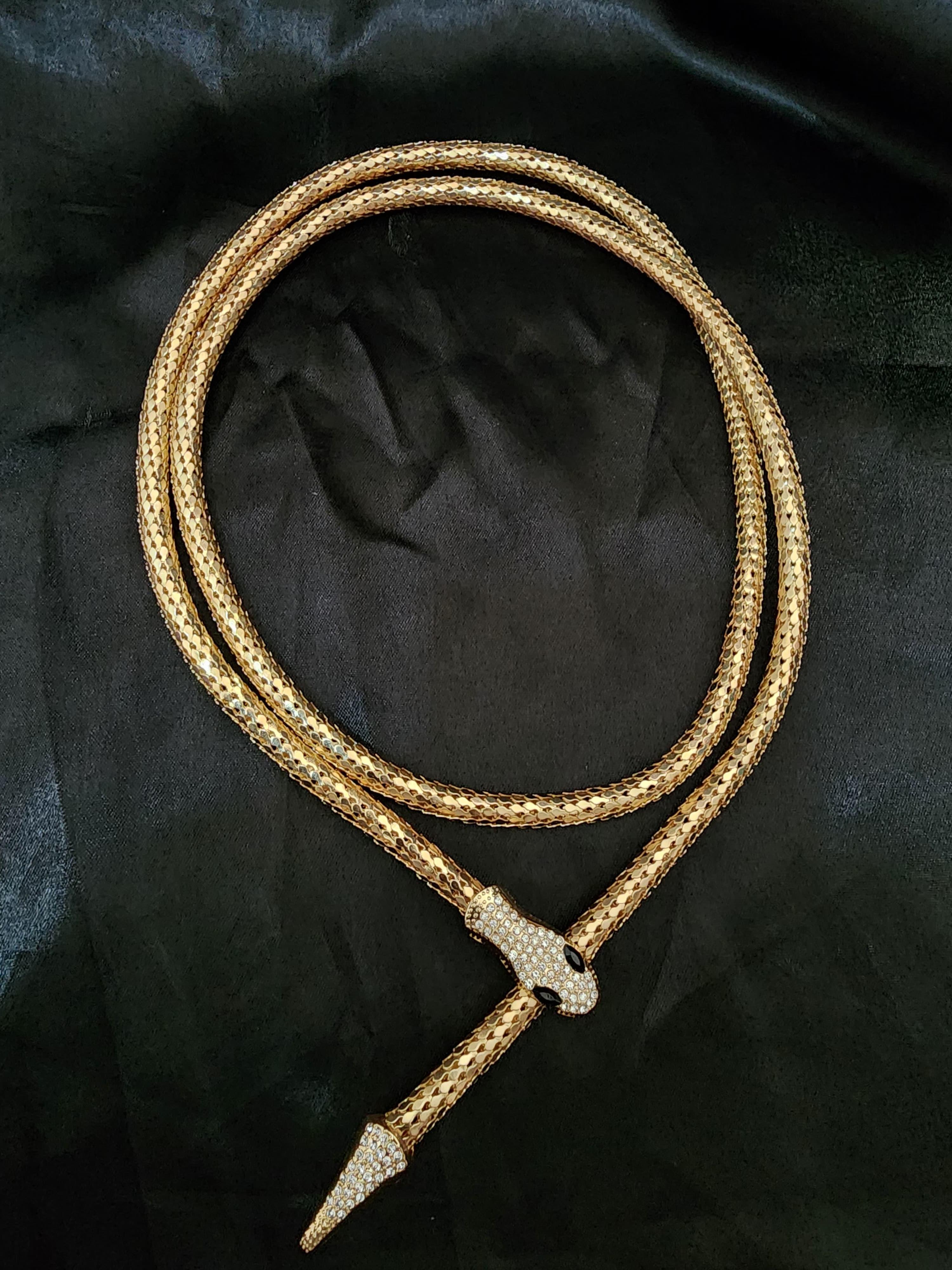Crafted with an intricate gold mesh that mimics serpent scales, this flexible necklace gracefully coils around the neck, ending in a striking dual-head design. Each head is encrusted with premium-quality American Diamonds and features deep onyx-like enamel eyes, capturing attention and admiration instantly.