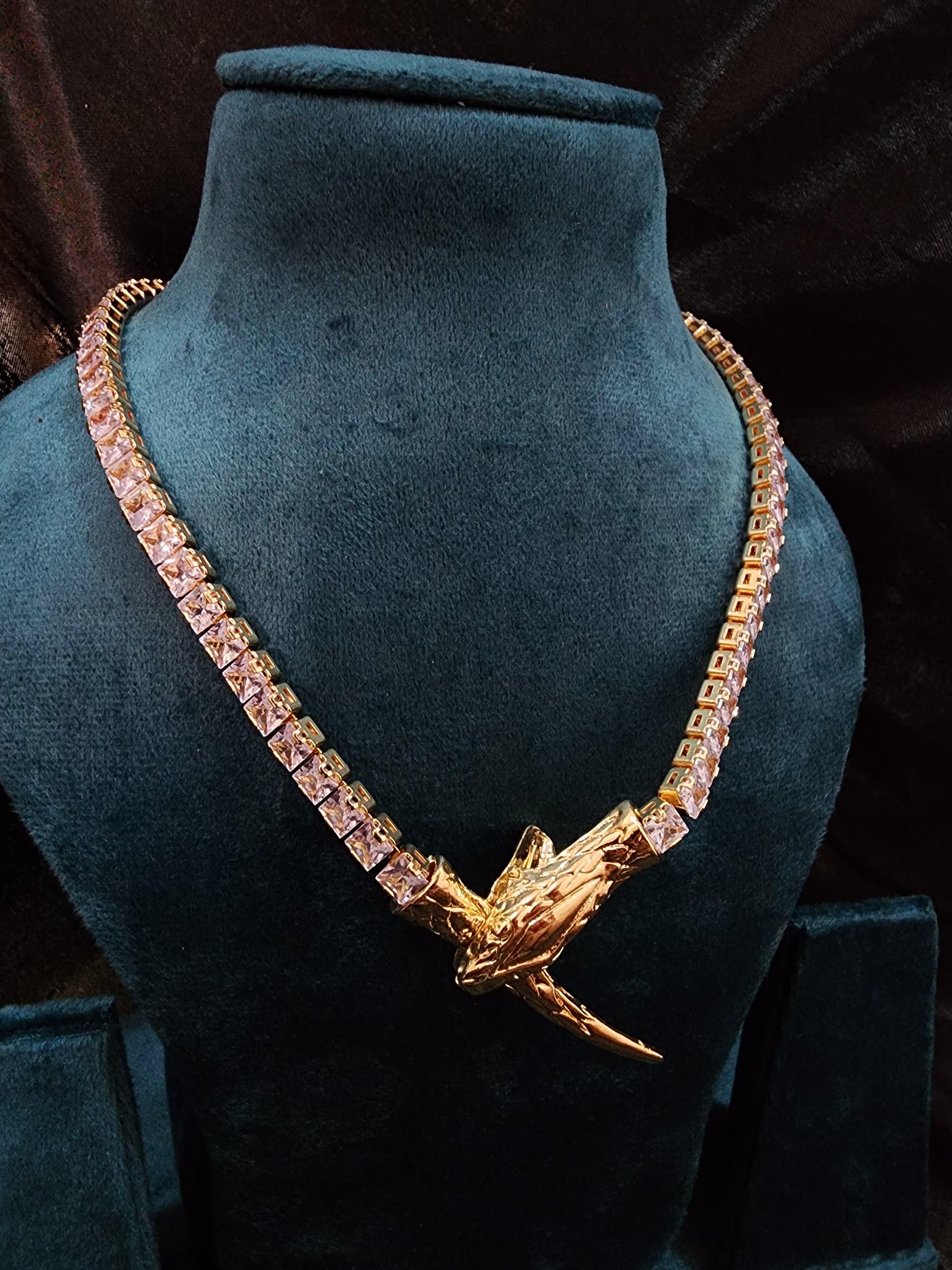 Each side of the necklace is adorned with meticulously set princess-cut American diamonds, reflecting brilliance with every movement. The gold-plated finish complements the icy sparkle, making it a head-turning choice for both modern and traditional ensembles.