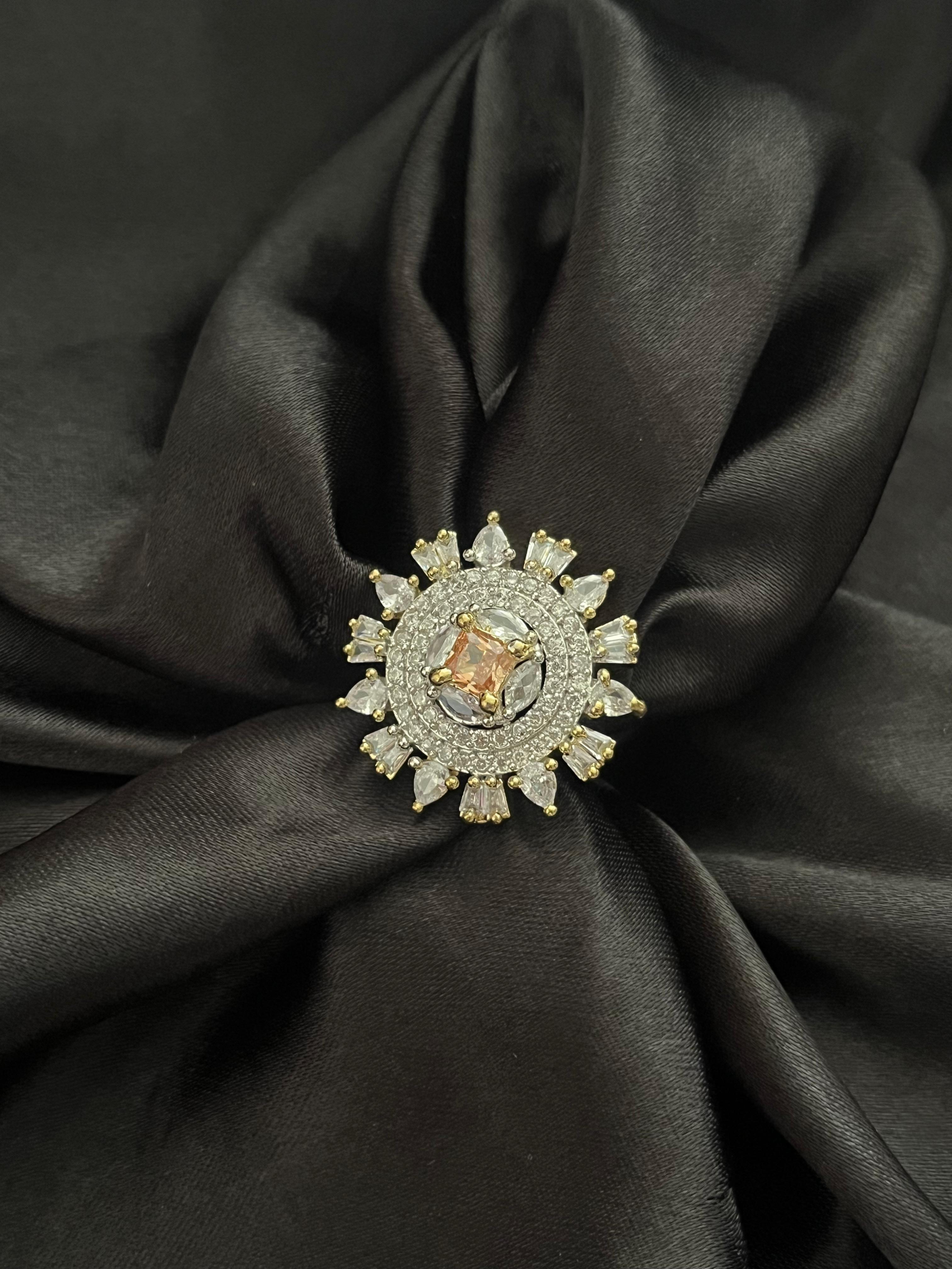 At its heart lies a champagne-hued princess-cut central stone, delicately nestled within concentric rows of micro-pave zirconia that glimmer with unmatched precision. Surrounding the core are alternating baguette, teardrop, and marquise-shaped American diamonds, meticulously set to form a dazzling halo reminiscent of solar flares — a symbol of power, grace, and timeless beauty.