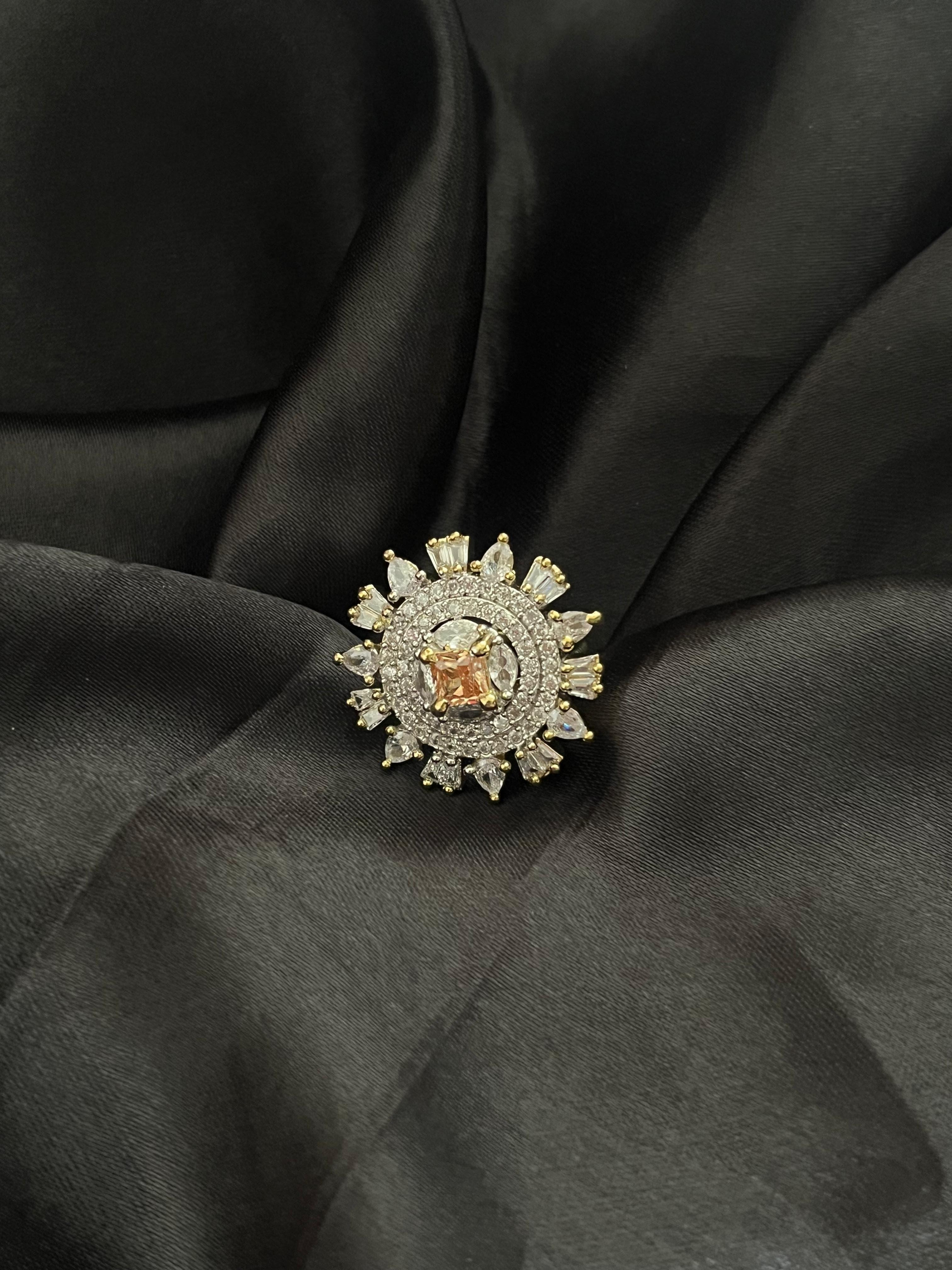 Introducing the Surya Radiance Cocktail Ring by Luxe Aabhushan — a stunning emblem of grandeur and celestial charm. Designed to captivate at every glance, this regal piece radiates brilliance inspired by the magnificence of the sun.
