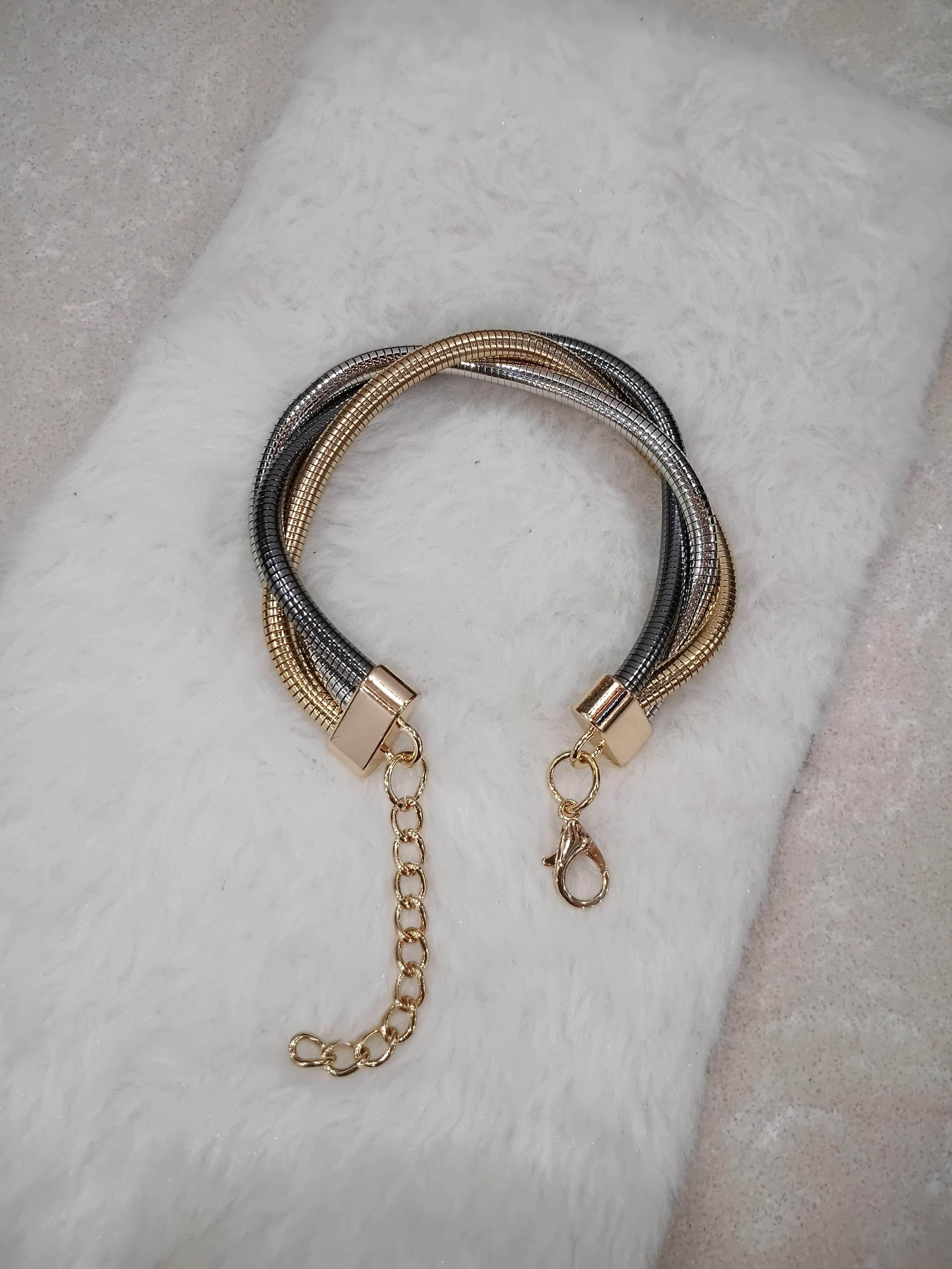 Crafted using high-quality flexible metal wires, the bracelet is secured with polished gold-tone clasp ends and a sturdy lobster lock with an adjustable extender chain, ensuring a perfect fit for all wrist sizes. Whether you're dressing up a formal outfit or adding a stylish edge to casual wear, Trilux is your go-to piece for contemporary charm and effortless style.