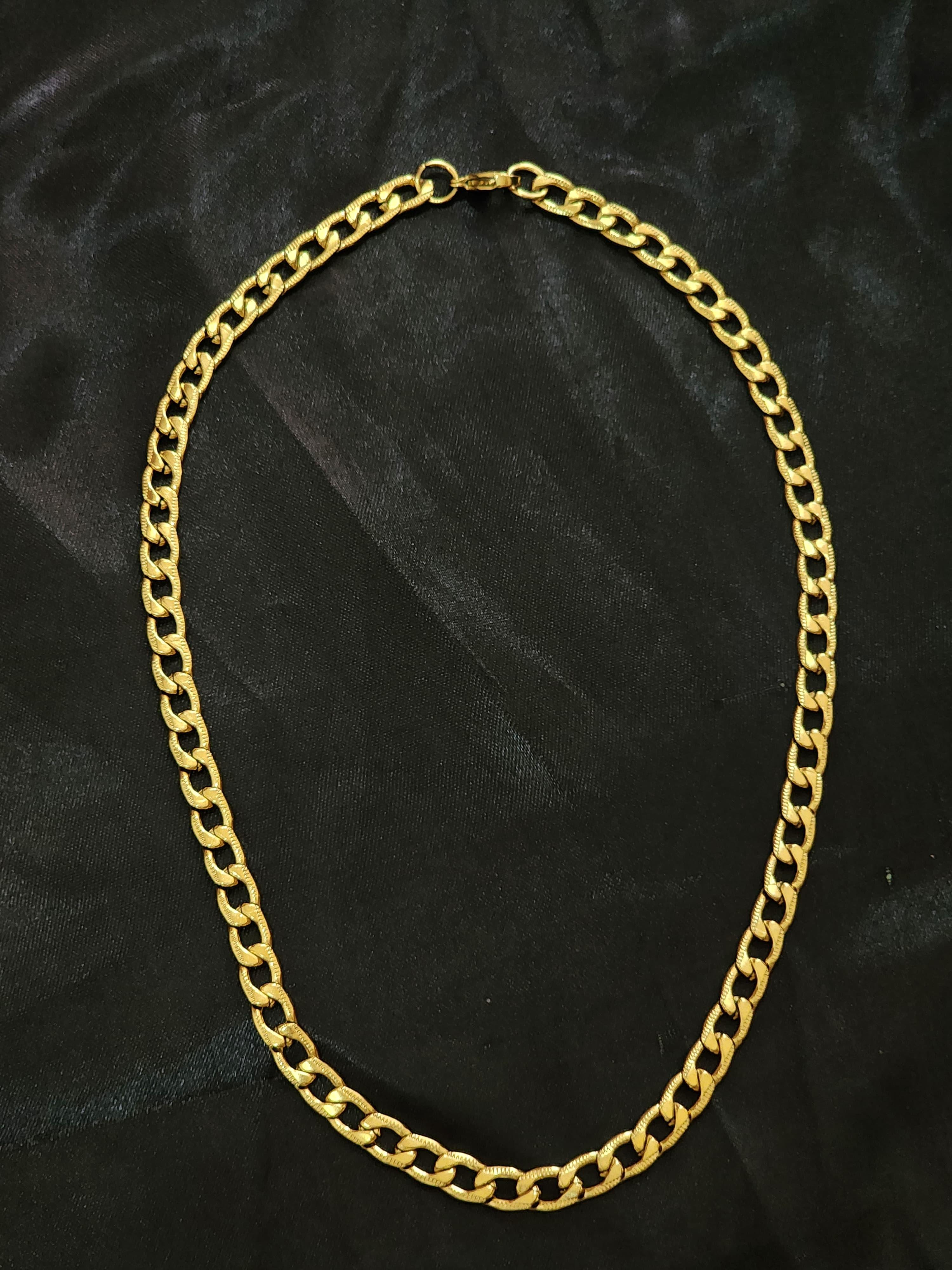 Crafted with precision, this necklace features a bold Cuban link chain design, finished in a rich, matte gold plating. Each link is subtly textured, adding a layer of visual depth and a refined tactile feel. The chain sits flat against the neckline, creating a clean and confident silhouette that transitions seamlessly from day to evening wear.