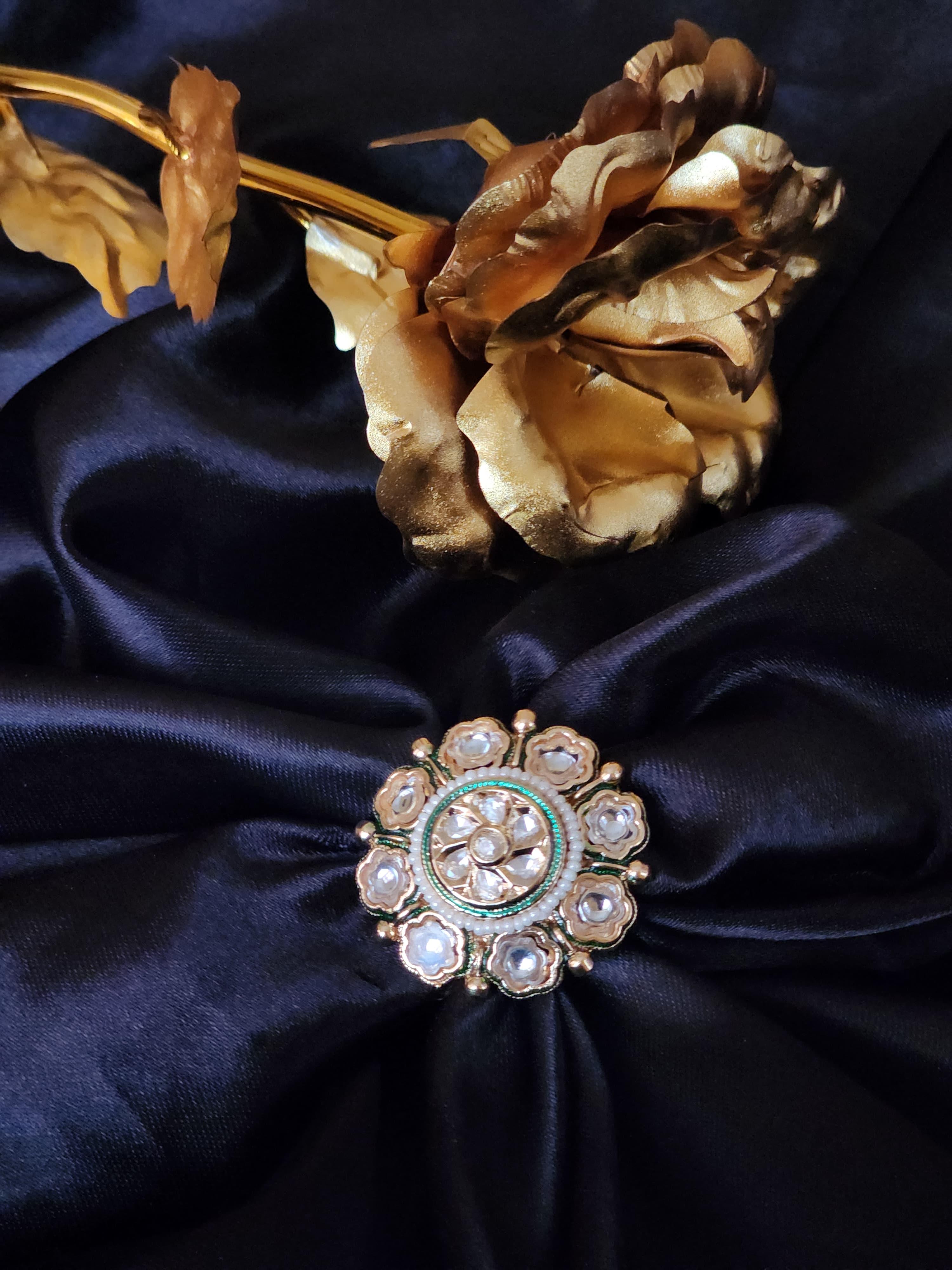 Accentuated with delicate handcrafted pearl beading and subtle touches of emerald green enamel, this ring embodies timeless opulence. The symmetrical floral pattern exudes regal charm, making it a perfect accessory for weddings, festive occasions, or heirloom gifting.